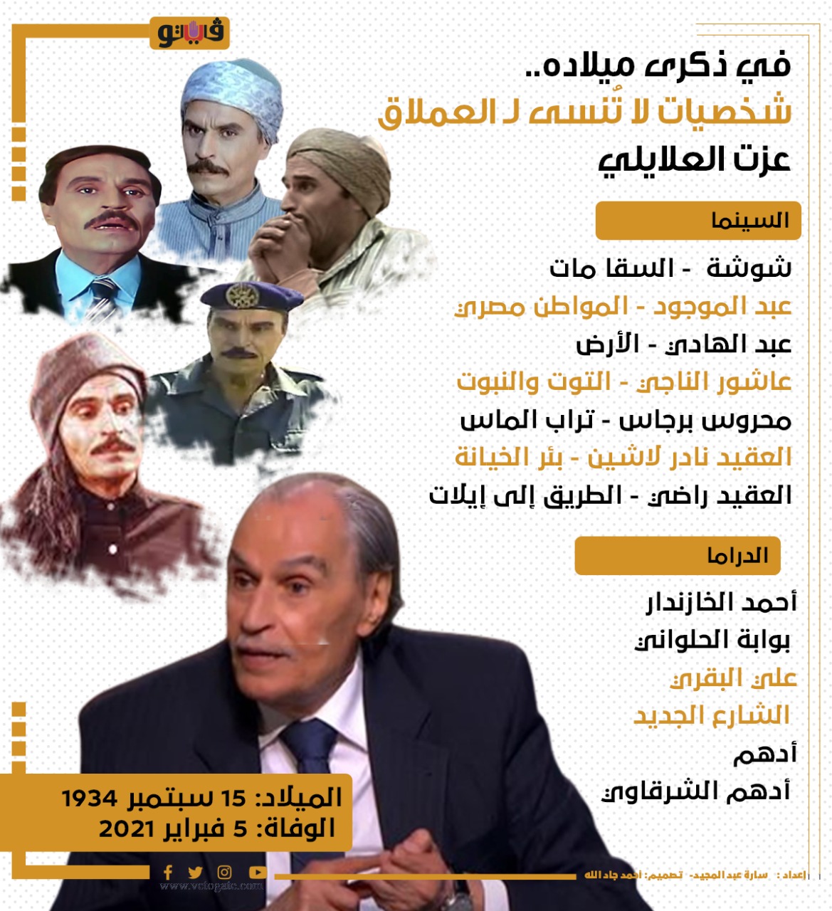 في ذكرى ميلاده.. شخصيات لا تُنسى لـ العملاق عزت العلايلي | إنفوجراف الخميس 15/سبتمبر/2022 - 09:38 م 9/15/2022 9:38:54 PM عزت العلايلي سارة عبد المجيد شارك طباعة 18 حجم الخط شارك طباعة التوت والنبوت ادهم الشرقاوي الطريق إلى إيلات مسلسل بوابة الحلواني مسلسل الجماعة فيلم تراب الماس فيلم الطريق الي ايلات بوابة الحلواني أدوار عزت العلايلى عزت العلايلي
