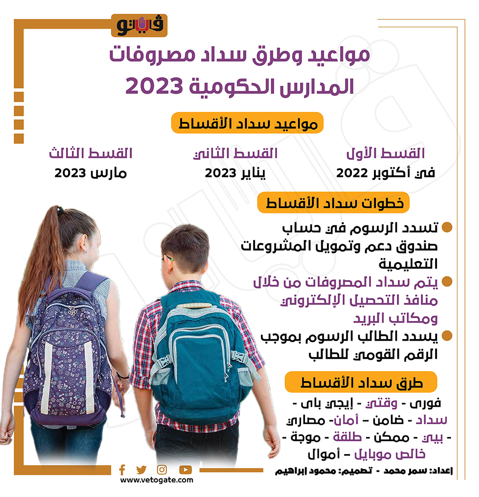 مواعيد وطرق سداد مصروفات المدارس الحكومية 2023 |أنفوجراف الخميس 15/سبتمبر/2022 - 04:54 م 9/15/2022 4:54:22 PM المصروفات الدراسية سمر محمد شارك طباعة 18 حجم الخط شارك طباعة المصاريف الدراسيه المصروفات الدراسية سداد المصروفات الدراسية مكاتب البريد