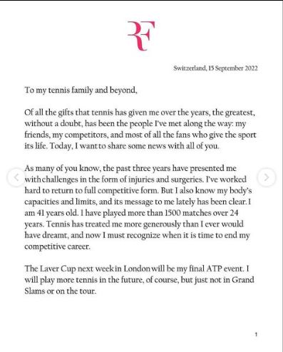 روجيه فيدرر أسطورة التنس يعلن اعتزاله