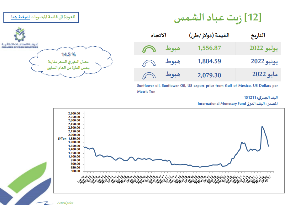 وشهد سعر زيت عباد الشمس انخفاضا خلال يونيو الماضي لنحو 1884.59 دولار للطن في مقابل 2079.3 دولار خلال مايو، بينما زاد بنسبة 14.5% على أساس سنوي.