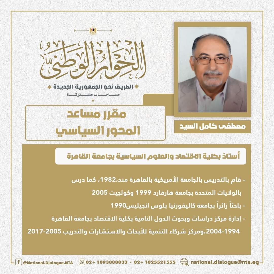 مصطفى كامل السيد أستاذ بكلية الاقتصاد والعلوم السياسية بجامعة القاهرة - قام بالتدريس بالجامعة الأمريكية بالقاهرة منذ،1982، كما درس بالولايات المتحدة بجامعة هارفارد 1999 وكولجيت 2005- باحثًا زائرًا بجامعة كاليفورنيا بلوس أنجلوس 1990- إدارة مركز دراسات وبحوث الدول النامية بكلية الاقتصاد بجامعة القاهرة 2004-1994،ومركز شركاء التنمية للأبحاث والاستشارات والتدريب 2005-2017.