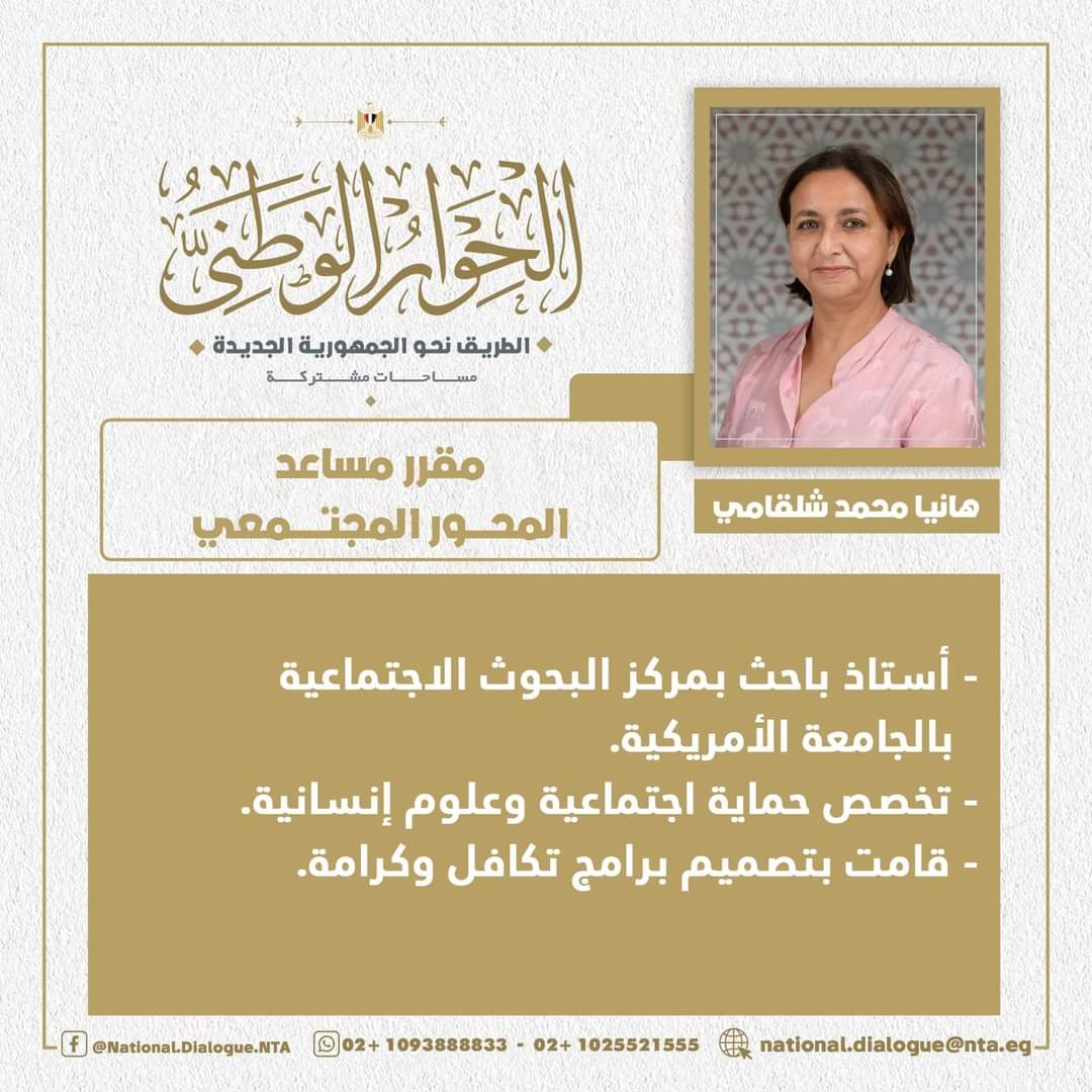 هانيا محمد شلقامي مقرر مساعد المحـور المجتمعي - أستاذ باحث بمركز البحوث الاجتماعية بالجامعة الأمريكية - تخصص حماية اجتماعية وعلوم إنسانية - قامت بتصميم برامج تكافل وكرامة.