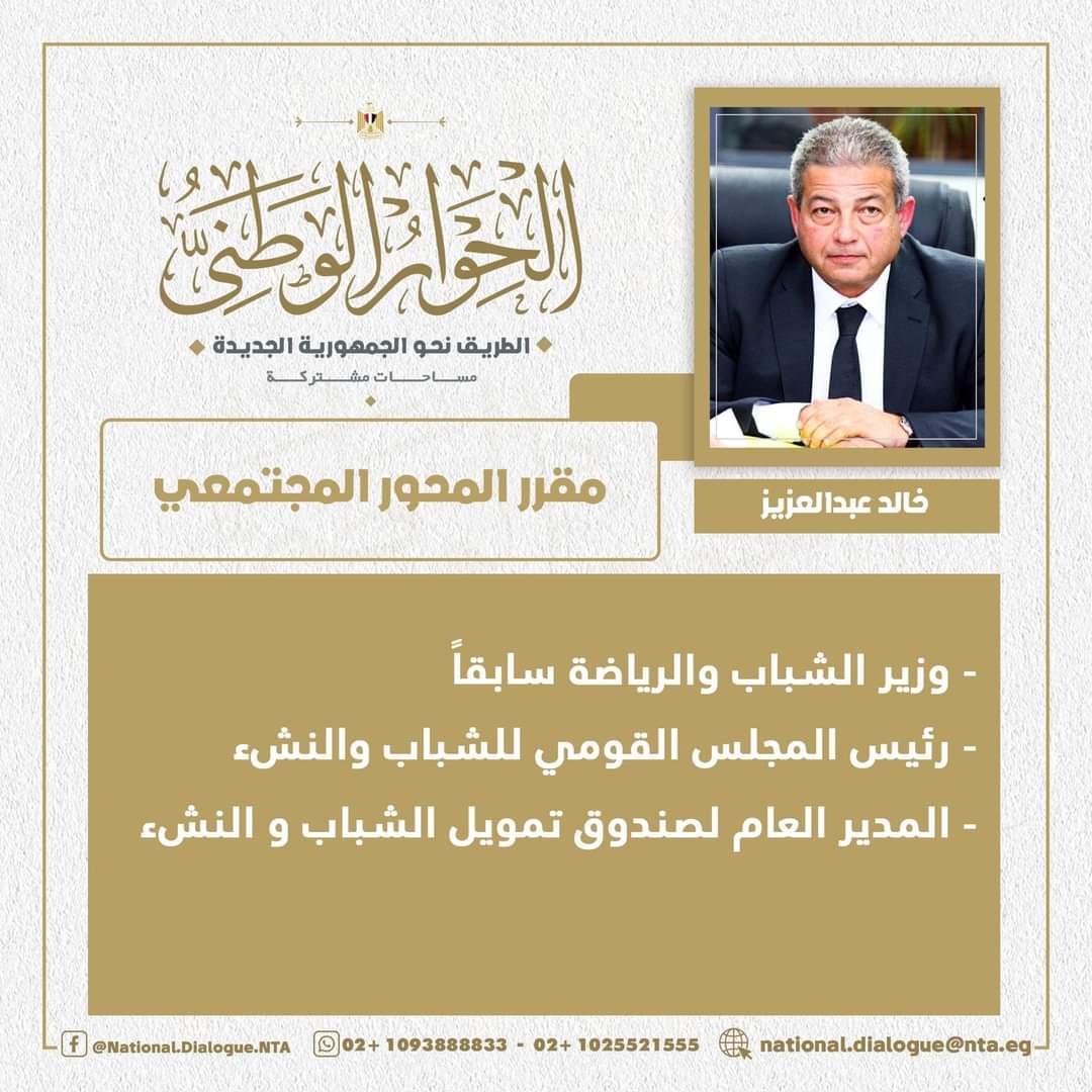 خالد عبد العزيز مقرر المحور المجتمعي - وزير الشباب والرياضة سابقًا - رئيس المجلس القومي للشباب والنشء - المدير العام لصندوق تمويل الشباب والنشء.