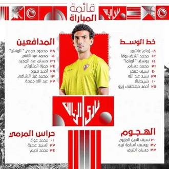 خط الوسط: إمام عاشور - محمد أشرف " روقا" - يوسف إبراهيم " أوباما- محمد حسام "بيسو" - سيف جعفر - سيد عبد الله "نيمار" - محمود عبد الرازق " شيكابالا" - أحمد مصطفى "زيزو".