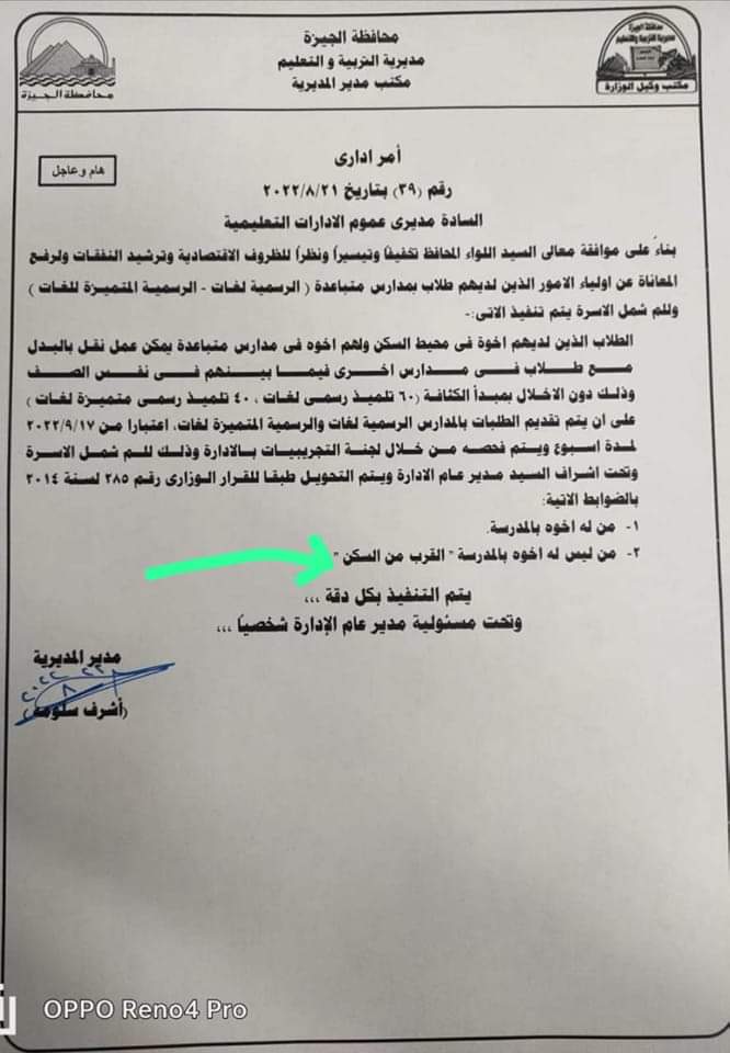 أصدر أشرف سلومة مدير الإدارة التعليمية بمحافظة الجيزة، قرارا خاصا يسمح بعملية بدل بين الطلاب الذين لهم أخوة في محيط السكن، ولهم أخوة في مدارس مع طلاب آخرين في مدارس أخرى فيما بينهم في نفس الصف، وبدون الإخلال بمبدأ الكثافة السكانية (٦٠ تلميذ رسمي للغات) و(٤٠ تلميذ رسمي بالمدارس المتميزة للغات).