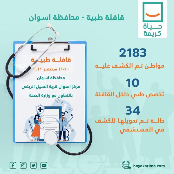 - وزارة الصحة وبالتعاون مع مؤسسة حياة كريمة نظموا قافلة طبية فى محافظة أسوان على مدار يومين 11 و12 سبتمبر بمركز أسوان قرية السيل الريفي.