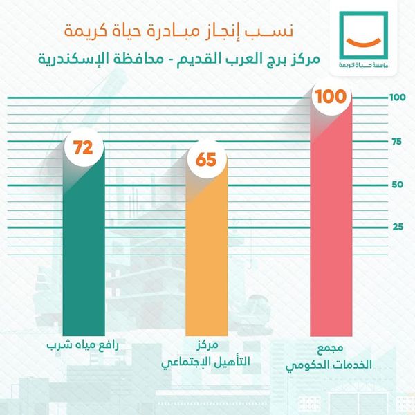 - في محافظة الإسكندرية بمنطقة برج العرب القديم قام فريق مؤسسة حياة كريمة، بمتابعة آخر التطورات في المشروعات الجارى تنفيذها في أكثر من قطاع، وأهمها مجمع الخدمات الحكومي ومركز التأهيل الاجتماعي ورافع مياه الشرب حيث تم الانتهاء منهم وتسليمهم في أقرب وقت ممكن.