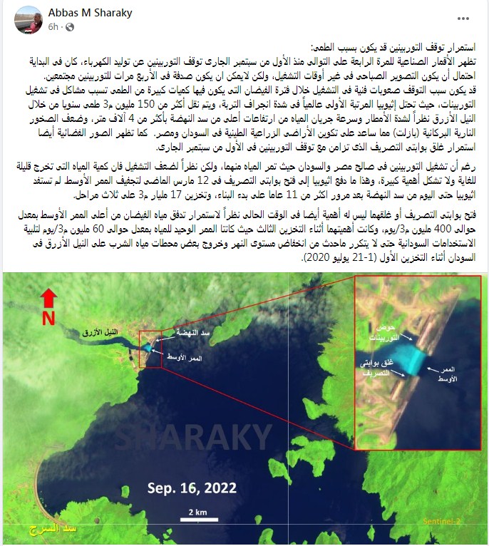 وكتب عباس شراقي تدوينة على الفيس بوك "استمرار توقف التوربينين قد يكون بسبب الطمى: تظهر الأقمار الصناعية للمرة الرابعة على التوالى منذ الأول من سبتمبر الجارى توقف التوربينين عن توليد الكهرباء، كان فى البداية احتمال أن يكون التصوير الصباحى فى غير أوقات التشغيل، ولكن لايمكن ان يكون صدفة فى الأربع مرات للتوربينين مجتمعين."