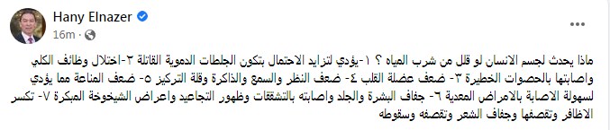 وكتب الدكتور هاني الناظر تغريدة على تويتر "ماذا يحدث لجسم الانسان لو قلل من شرب المياه ؟ ١-يؤدي لتزايد الاحتمال بتكون الجلطات الدموية القاتلة ٢-اختلال وظائف الكلى وإصابتها بالحصوات الخطيرة ٣- ضعف عضلة القلب ٤- ضعف النظر والسمع والذاكرة وقلة التركيز"