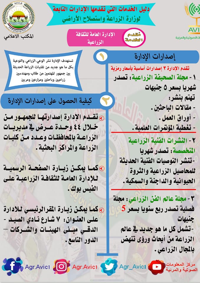 أصدر مركز المعلومات الصوتية والمرئية بوزارة الزراعة واستصلاح الأراضي، والمكتب الاعلامي للوزارة، العدد رقم ١٢ من سلسلة دليل الخدمات التي تقدمها الادارات التابعة للوزارة، للمزارع والمربي والمواطن، حيث يستعرض هذا العدد من خلال فيديو وانفوجراف، الخدمات التي تقدمها الإدارة العامة للثقافة الزراعية، التابعة لقطاع الارشاد الزراعي.