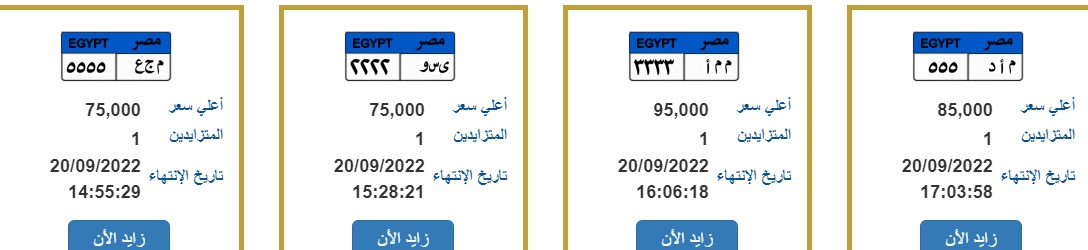 كما ضمت اللوحات المميزة "م أ د 555" بقيمة 85 ألف جنيه، "م م أ 3333" بقيمة 95 ألف جنيه، "ي س و2222" بقيمة 75 ألف جنيه، "م ج ع 5555" بقيمة 75 ألف جنيه.