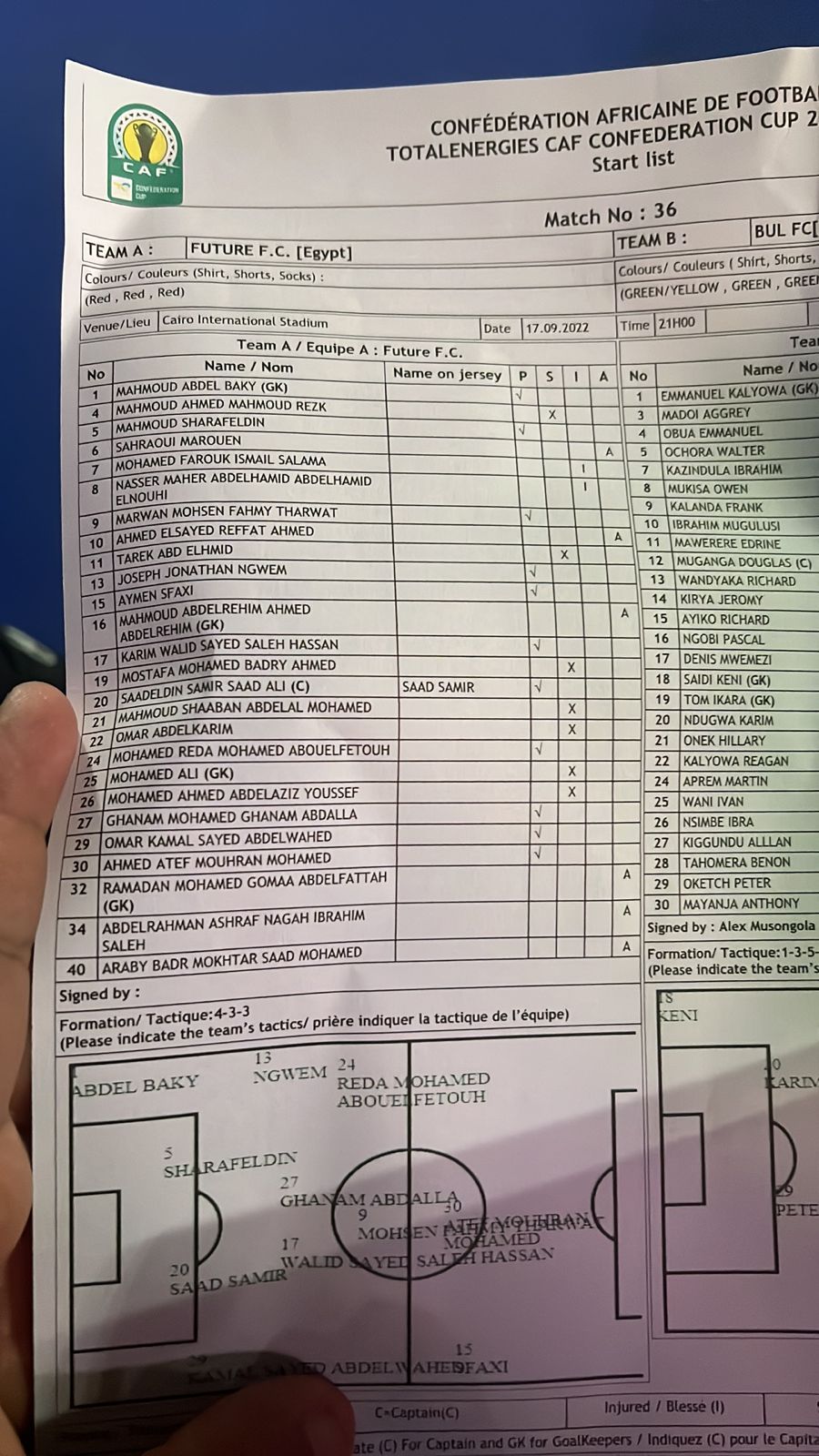 ويفتقد فيوتشر للاعبين من أهم عناصره الأساسية، هما محمود عبد الرحيم جنش حارس المرمى، وأحمد رفعت الجناح الأيسر، وذلك بعد العقوبة التي تم توقيعها عليهما من نادي فيوتشر بتوقيع غرامة مادية قاسية واستبعادهما من مباراة العودة أمام بول، بعد المشادة التي حدثت بينهما عقب نهاية مباراة الذهاب في أوغندا.