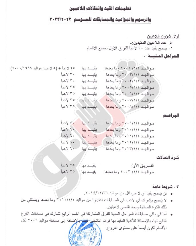 ** لن يسمح بقيد أي لاعب أقل من مواليد 31-12-2014.