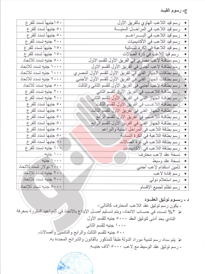 كما كشفت اللائحة الجديدة لاتحاد الكرة الخاصة بتعليمات القيد وانتقالات اللاعبين للموسم الجديد على ضرورة أن يقوم النادي بتوثيق عقود الأجهزة الفنية والإدارية بالاتحاد حتى يتسنى لهم استخراج بطاقات دخول المباريات للموسم الجديد على أن يكون رسم توثيق عقود الأجهزة الفنية هي نسبة 3% من القيمة السنوية للتعاقد بالاضافة الى 14 % قيمة مضافة بالإضافة إلى رسوم تنمية موارد الدولة.