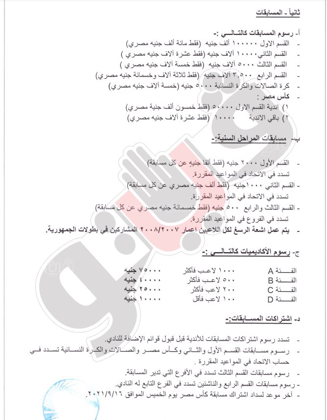 أما بخصوص كرة الصالات فيتم قيد 25 لاعبًا بالفريق الأول و25 لاعبا بمواليد 1-1-2003 وما بعدها.