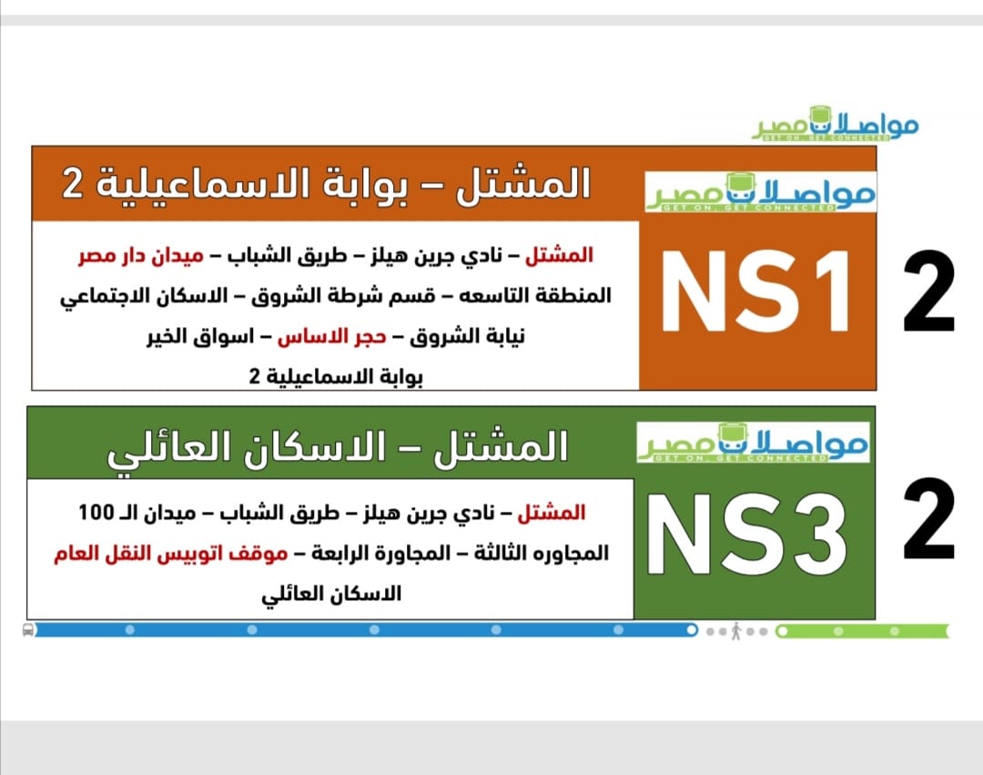 وأوضح رئيس الجهاز أن الخطين تابعين لكبرى الشركات المتخصصة فى نقل الركاب، مضيفًا أن مسار الخط الأول هو ( المشتل – جرين هيلز – طريق الشباب – المنطقه التاسعة - قسم الشرطة – النيابة – حجر الأساس – أسواق الخير – مدخل الإسماعيلية 2 )، والخط الثاني ( المشتل – جرين هيلز – طريق الشباب – ميدان ال100م – مجاورة 3 – مجاورة 4 – موقف النقل العام – العائلى ).