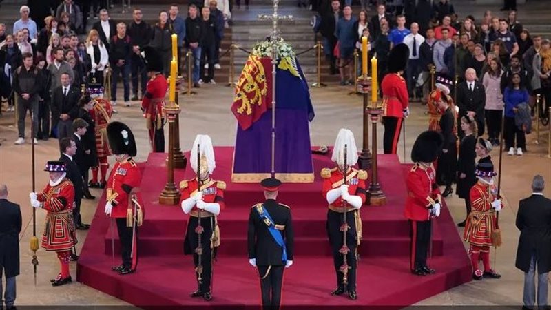 وأقام أحفاد الملكة إليزابيث الثمانية وقفة احترام لمدة 15 دقيقة حول نعشها، وكان بينهم الأميران وليام وهاري اللذان ارتديا الزي العسكري بناءً على طلب الملك تشارلز الثالث.