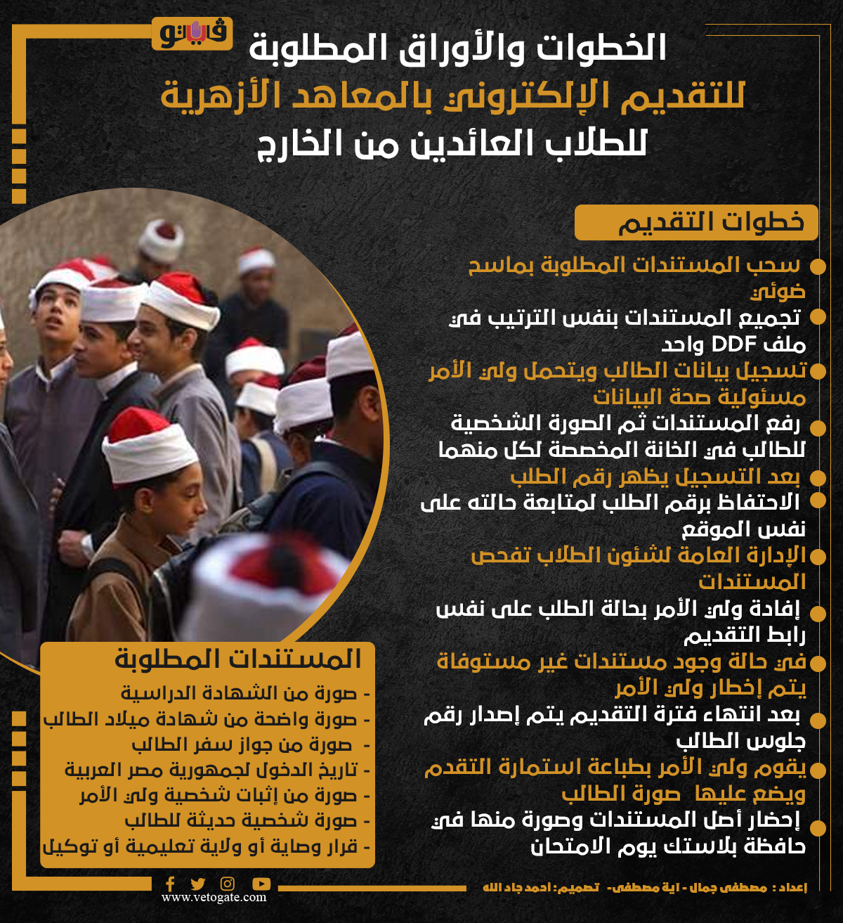 الخطوات والأوراق المطلوبة للتقديم الإلكتروني بالمعاهد الأزهرية للطلاب العائدين من الخارج | انفوجراف الثلاثاء 20/سبتمبر/2022 - 12:21 م 9/20/2022 12:21:21 PM المعاهد الازهرية مصطفى جمال - آية مصطفى شارك طباعة 18 حجم الخط شارك طباعة التقديم الإلكتروني جمهورية مصر العربية مصر العربية جواز سفر العائدين من الخارج لمعاهد الأزهرية