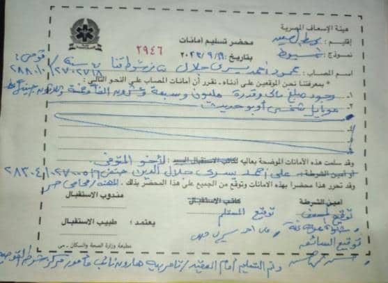وبعدها حضر كل من حسن محمد حسن، سائق سيارة الإسعاف وشنودة معوض نخلة، مسعف إلي ديوان مركز شرطة منفلوط وحرروا محضر تسليم أمانة بمبلغ مليون و27 ألف جنيه قد عثروا عليهم في موقع الحادث أثناء نقل جثة قادها الذي وجدوه جثة هامدة بموقع الحادث.