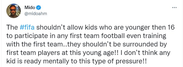 وكتب أحمد حسام ميدو تغريدة على تويتر "يجب ألا تسمح الفيفا للأطفال الذين تقل أعمارهم عن 16 عامًا بالمشاركة في أي فريق كرة قدم أول حتى التدرب مع الفريق الأول.. لا ينبغي أن يكونوا محاطين بلاعبي الفريق الأول في هذا السن المبكر! لا أعتقد أن أي طفل مستعد عقليًا لهذا النوع من الضغط"