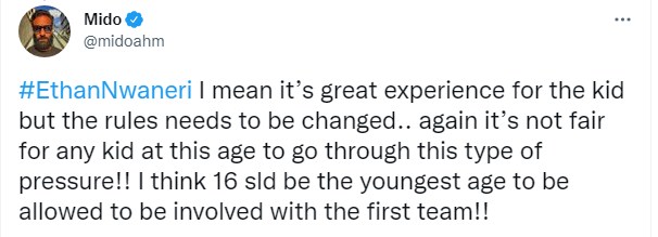 وقال ميدو: "# إيثان نوانيري.. أعني أنها تجربة رائعة للطفل لكن القواعد يجب تغييرها.. مرة أخرى ليس من العدل أن يمر أي طفل في هذا العمر بهذا النوع من الضغط!! أعتقد أن سن 16 هو أصغر سن يسمح له بالاشتراك مع الفريق الأول!!"
