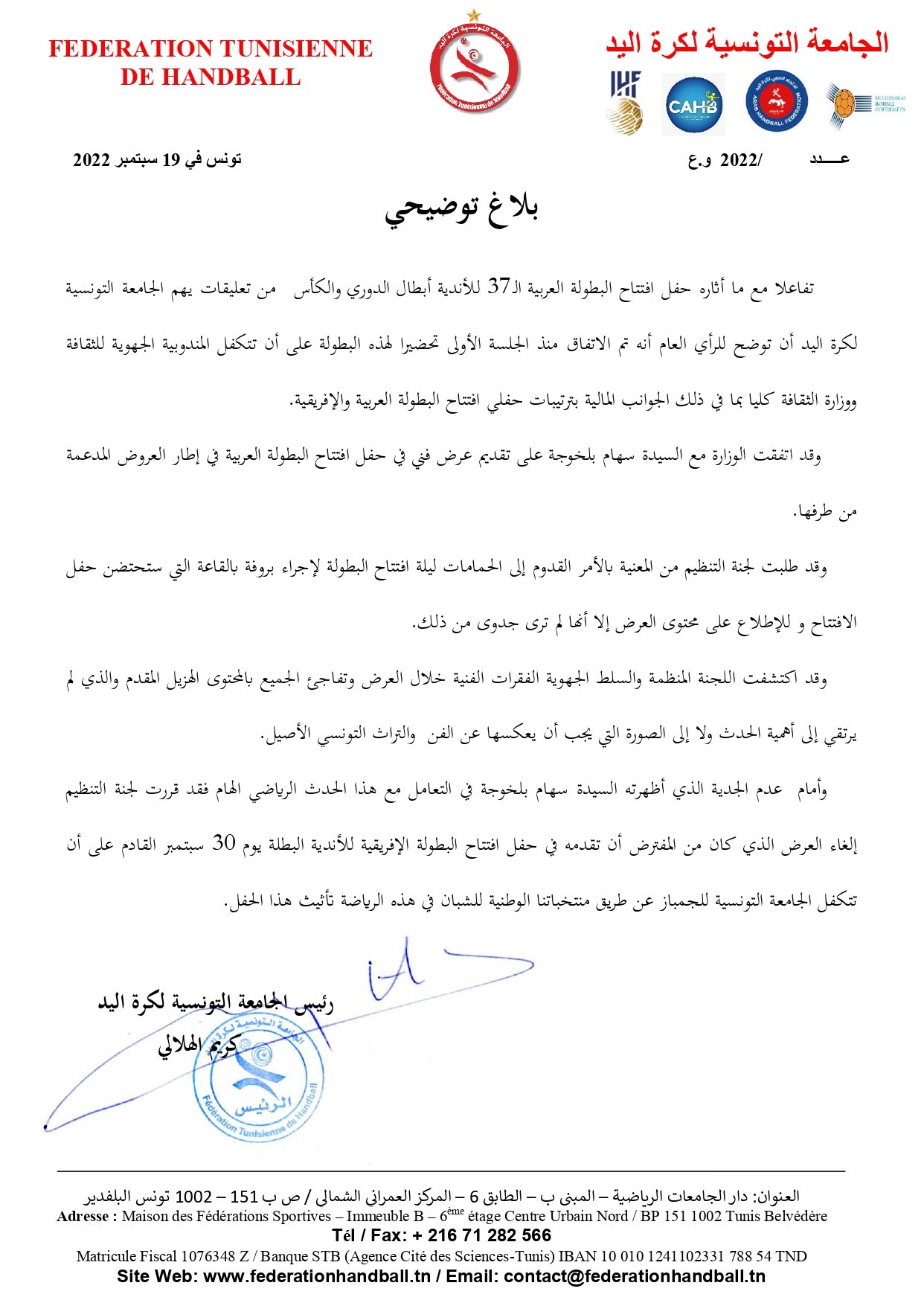 وأتم: "أمام عدم الجدية الذي أظهرته السيدة سهام بلخوجة (مسؤولة العرض) في التعامل مع هذا الحدث الرياضي المهم، فقد قررت لجنة التنظيم إلغاء العرض الذي كان من المفترض أن تقدمه في حفل افتتاح البطولة الإفريقية للأندية يوم 30 سبتمبر، على أن يتكفل الاتحاد التونسي للجمباز عن طريق منتخباتنا الوطنية للشبان بهذا الحفل".