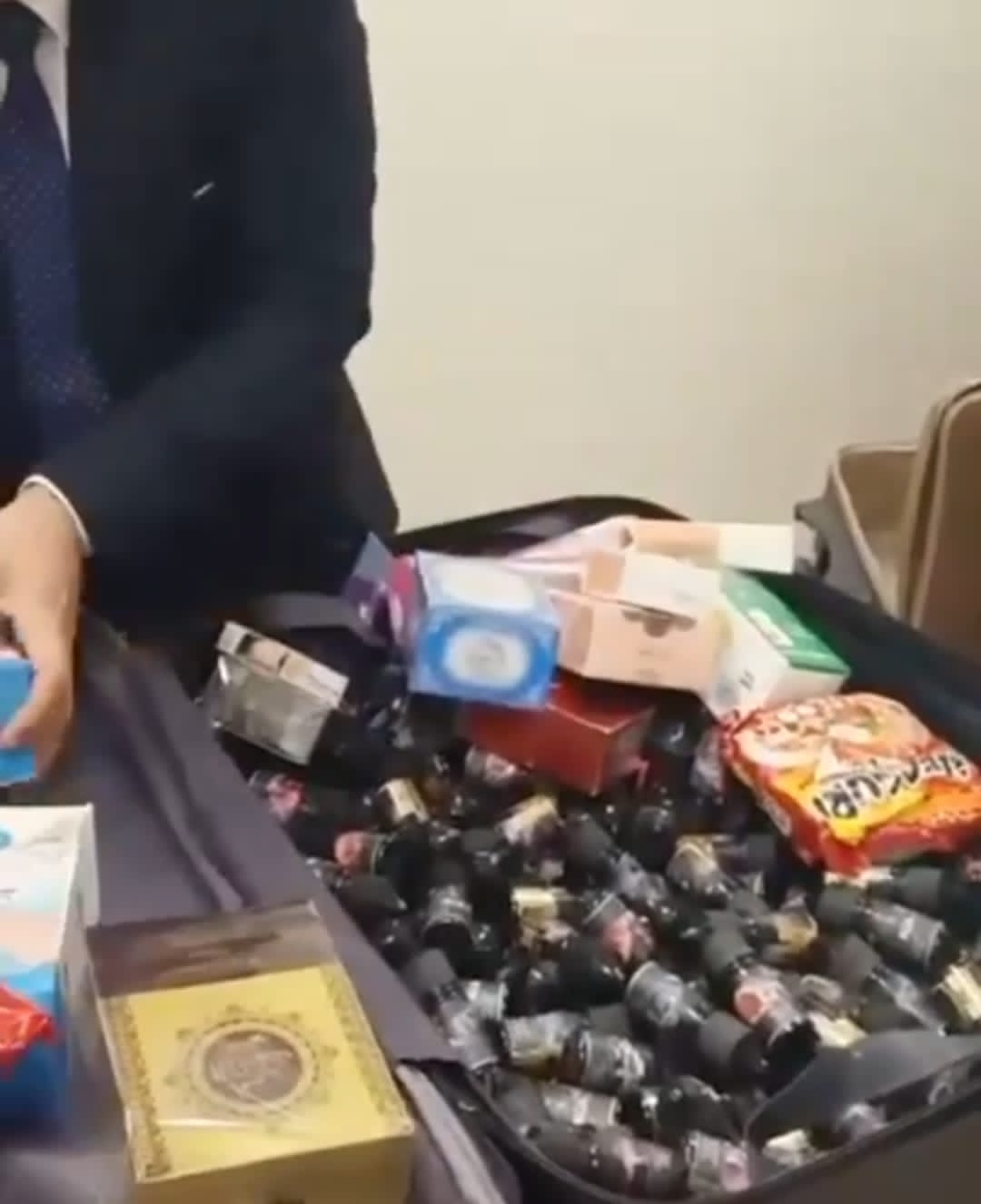 وبالعرض على أحمد حسن أحمد الحكش مدير الإدارة الثانية بالإنابة، قام بتكليف عمرو عطية الدسوقي مدير الحركة المشرف على العمل بالصالة الخضراء، وسامي نبيل سامي مأمور الجمرك المكلف بالعمل بالصالة الخضراء، بفتيش أمتعة الراكب فتبين وجود عدد من السجائر الإلكترونية وزجاجات زيت الشيش الإلكترونية مخبأة بين طيات الملابس.