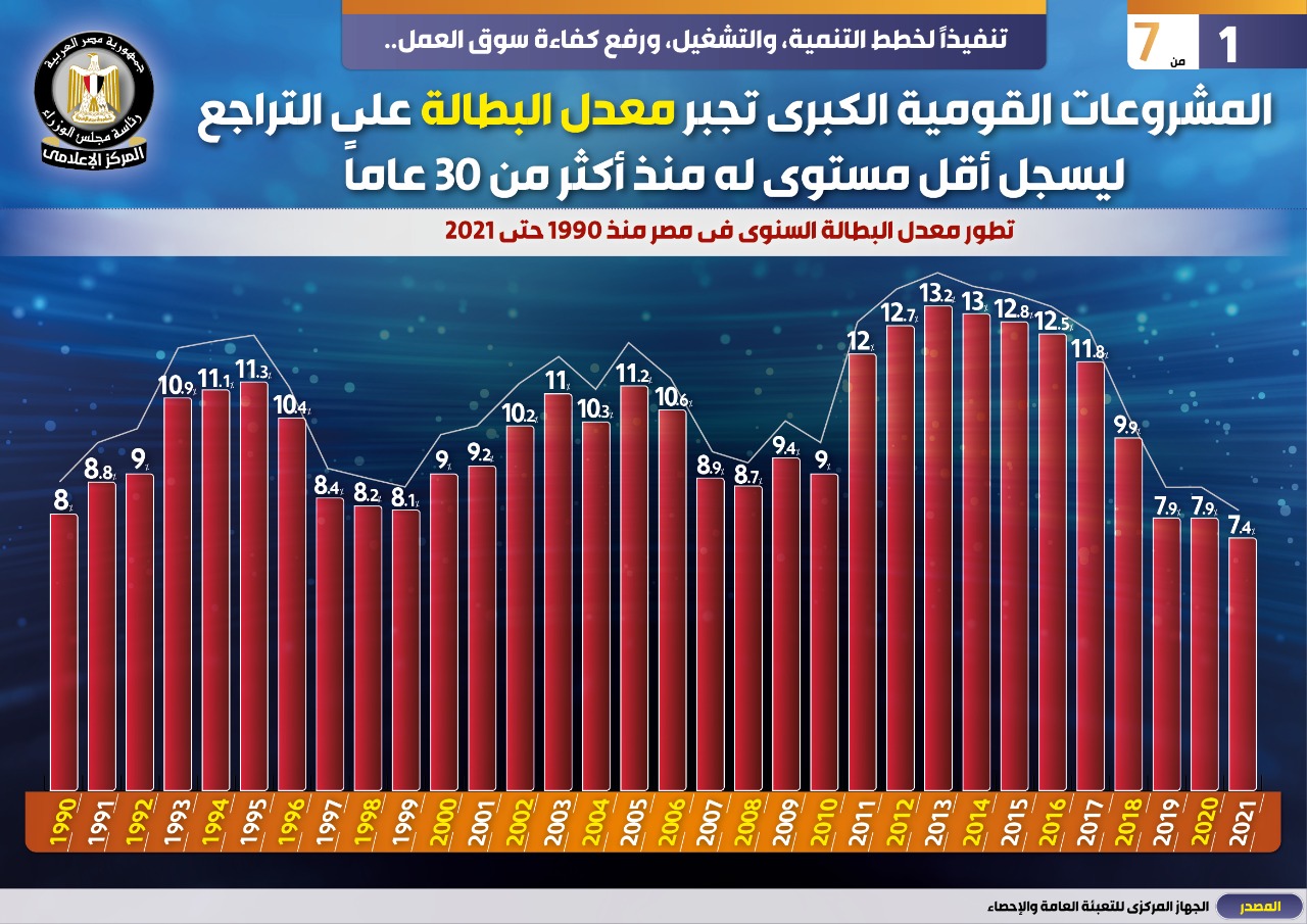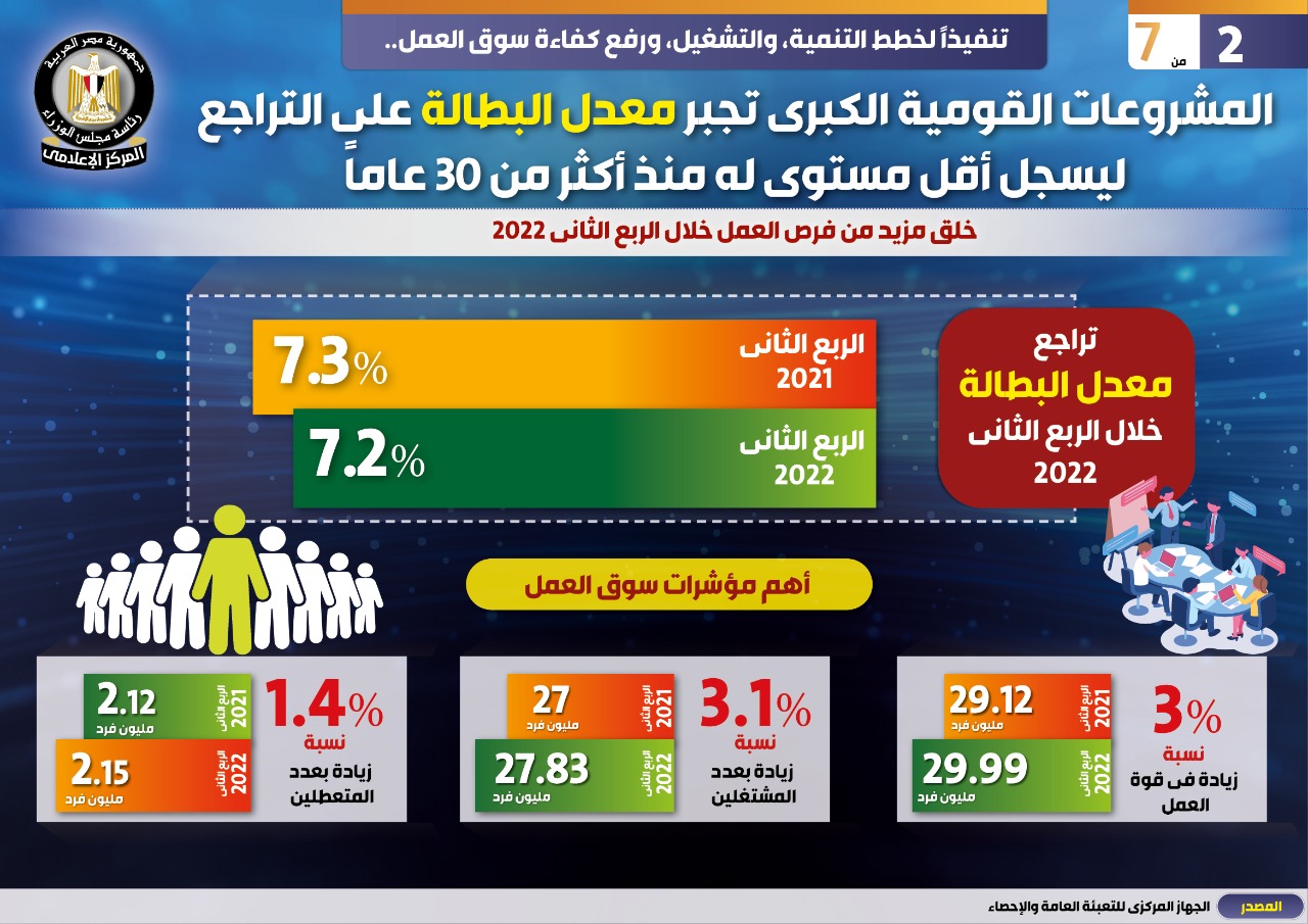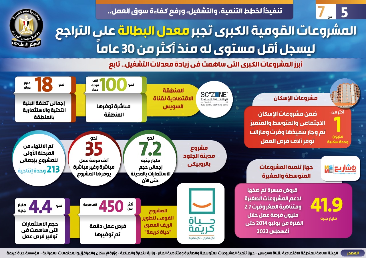 وفي هذا الصدد نشر المركز الإعلامي لمجلس الوزراء تقريرًا تضمن إنفوجرافات تحت عنوان "المشروعات القومية الكبرى تجبر معدل البطالة على التراجع ليسجل أقل مستوى له منذ أكثر من ٣٠ عامًا " وذلك تنفيذًا لخطط التنمية، والتشغيل، ورفع كفاءة سوق العمل.