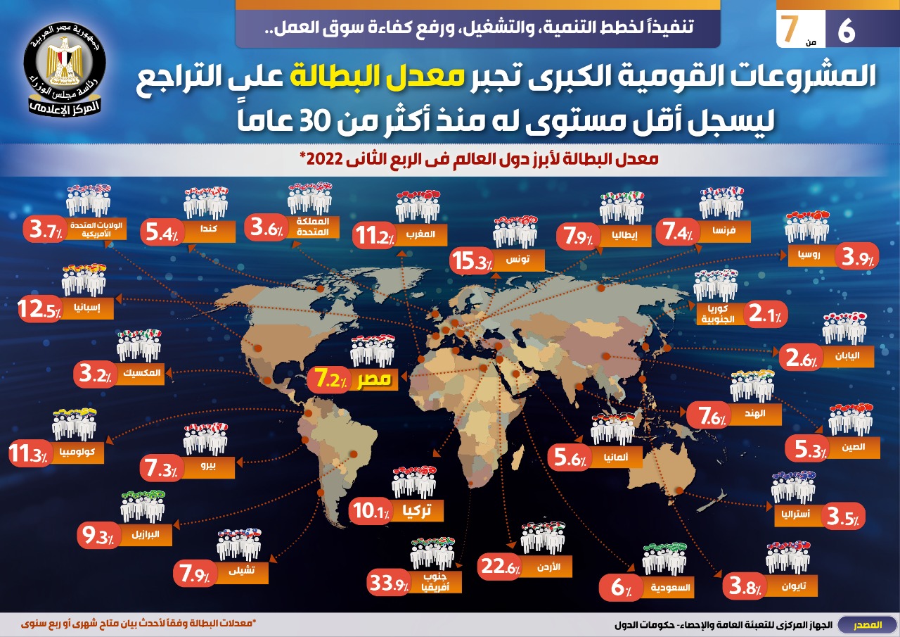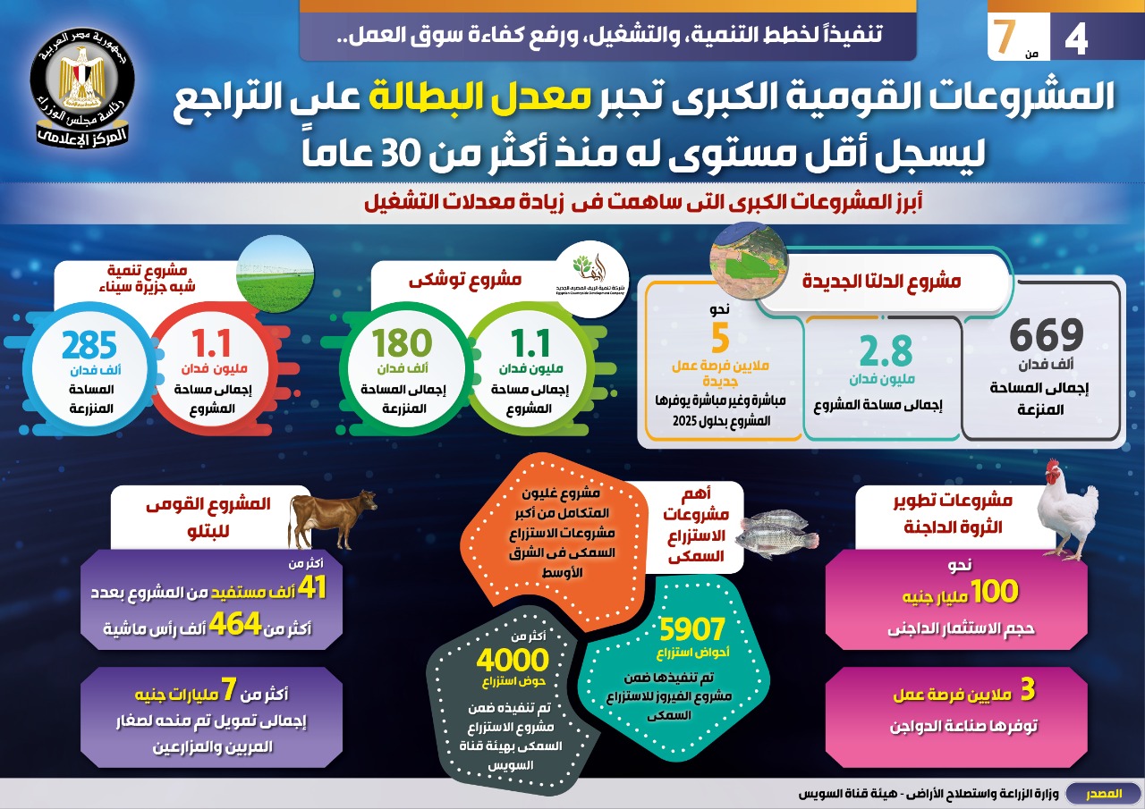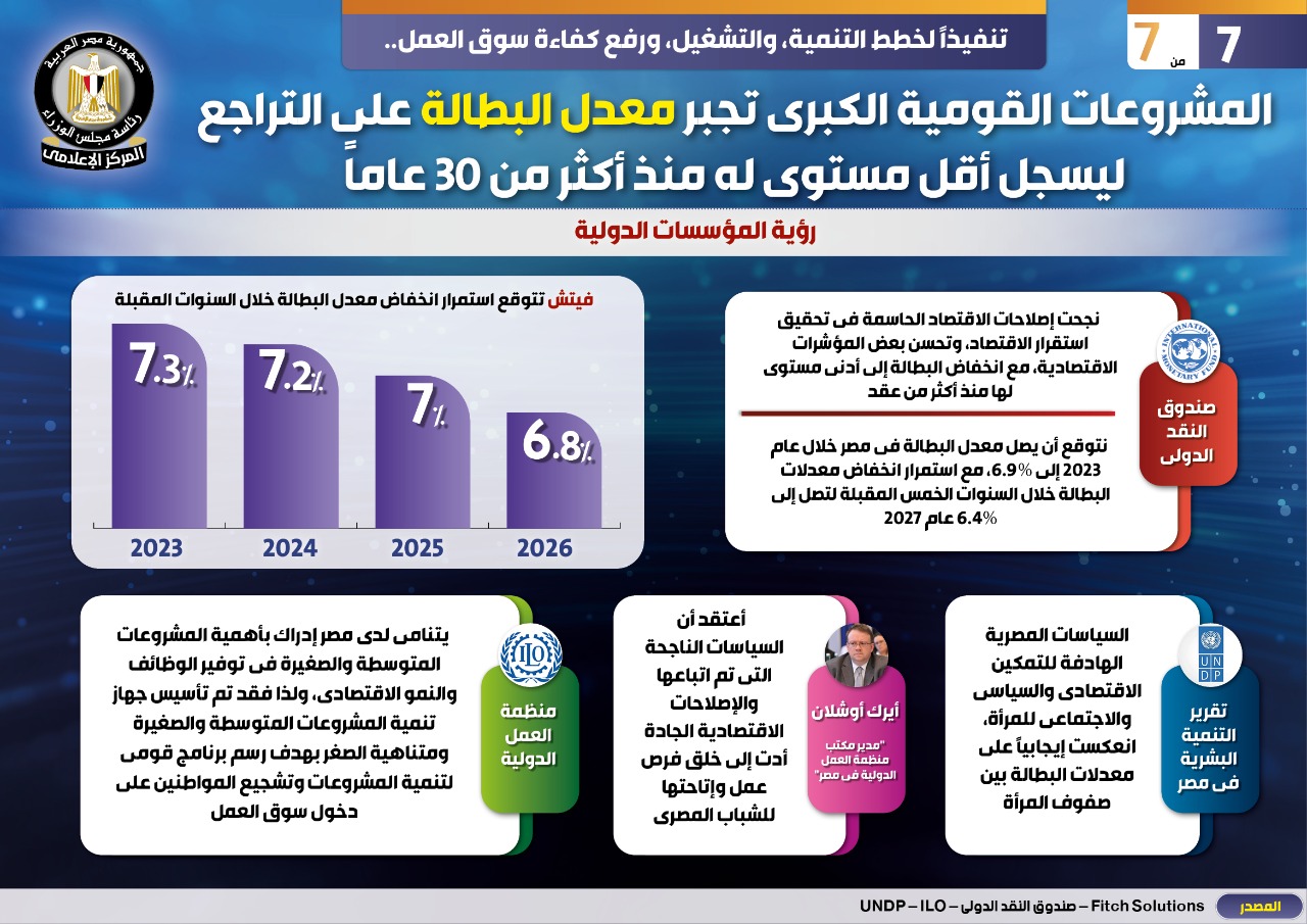 وفي هذا الصدد نشر المركز الإعلامي لمجلس الوزراء تقريرًا تضمن إنفوجرافات تحت عنوان "المشروعات القومية الكبرى تجبر معدل البطالة على التراجع ليسجل أقل مستوى له منذ أكثر من ٣٠ عامًا " وذلك تنفيذًا لخطط التنمية، والتشغيل، ورفع كفاءة سوق العمل.