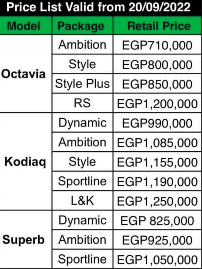 ويستعرض التقرير التالي أسعار سيارات سكودا بعد الزيادة والتى ضمت كالتالي سيارات أوكتافيا - وسيارات كودياك - وسيارات سوبيرب بقيمة تتراوح بين 140 إلى 490 ألفًا.