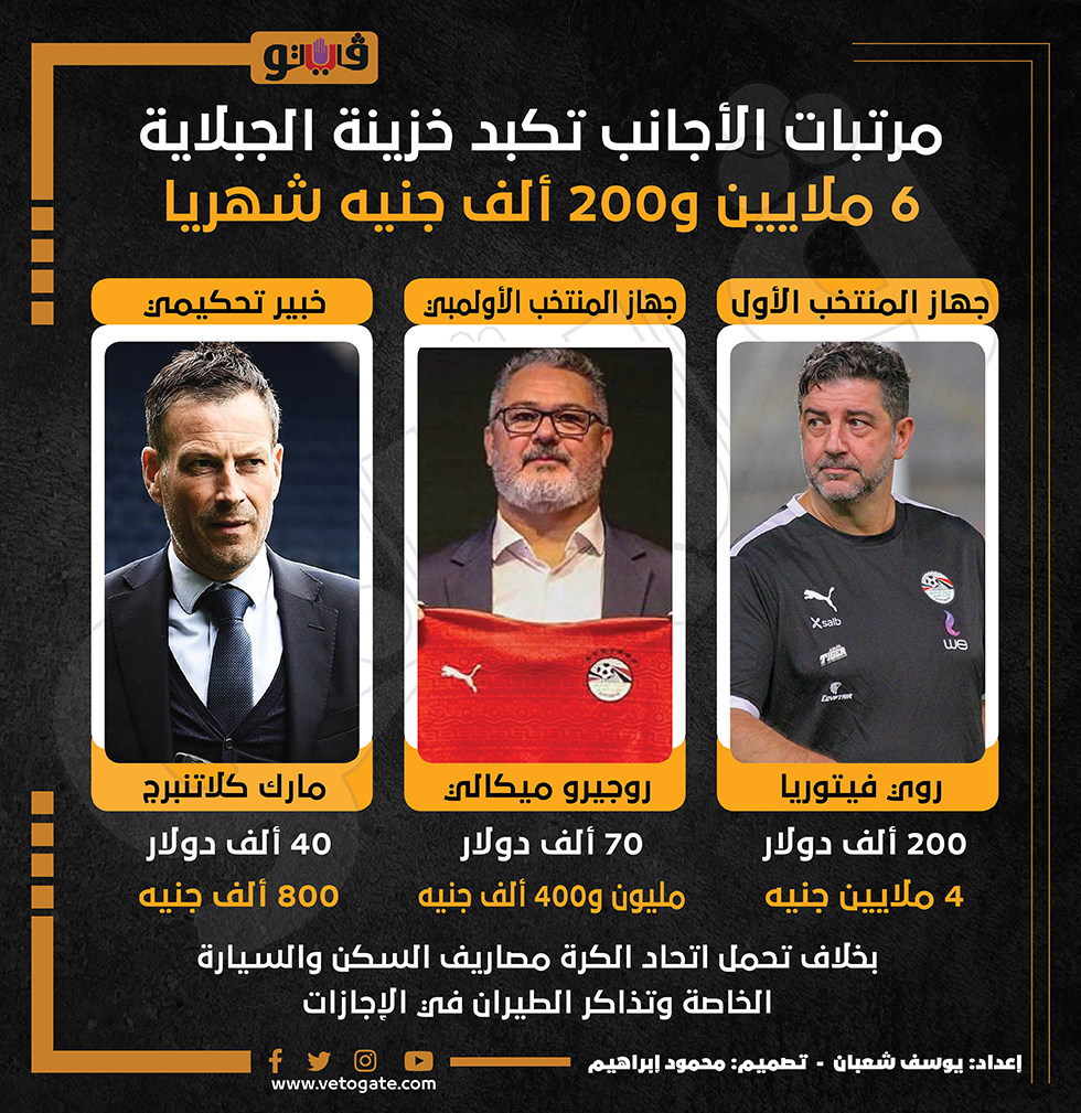 مرتبات الأجانب تكبد خزينة الجبلاية 6 ملايين و200 ألف جنيه شهريا | إنفوجراف الثلاثاء 20/سبتمبر/2022 - 09:03 م 9/20/2022 9:03:29 PM اتحاد الكرة المصري يوسف شعبان شارك طباعة 18 حجم الخط شارك طباعة فيتوريا روجيرو ميكالي كلاتنبرج الاتحاد المصري لكرة القدم روي فيتوريا