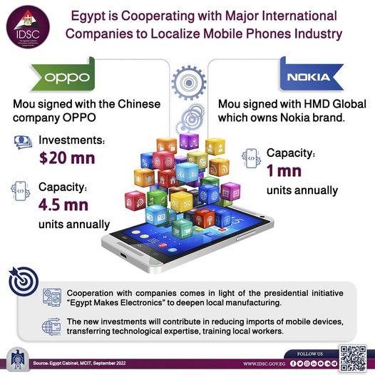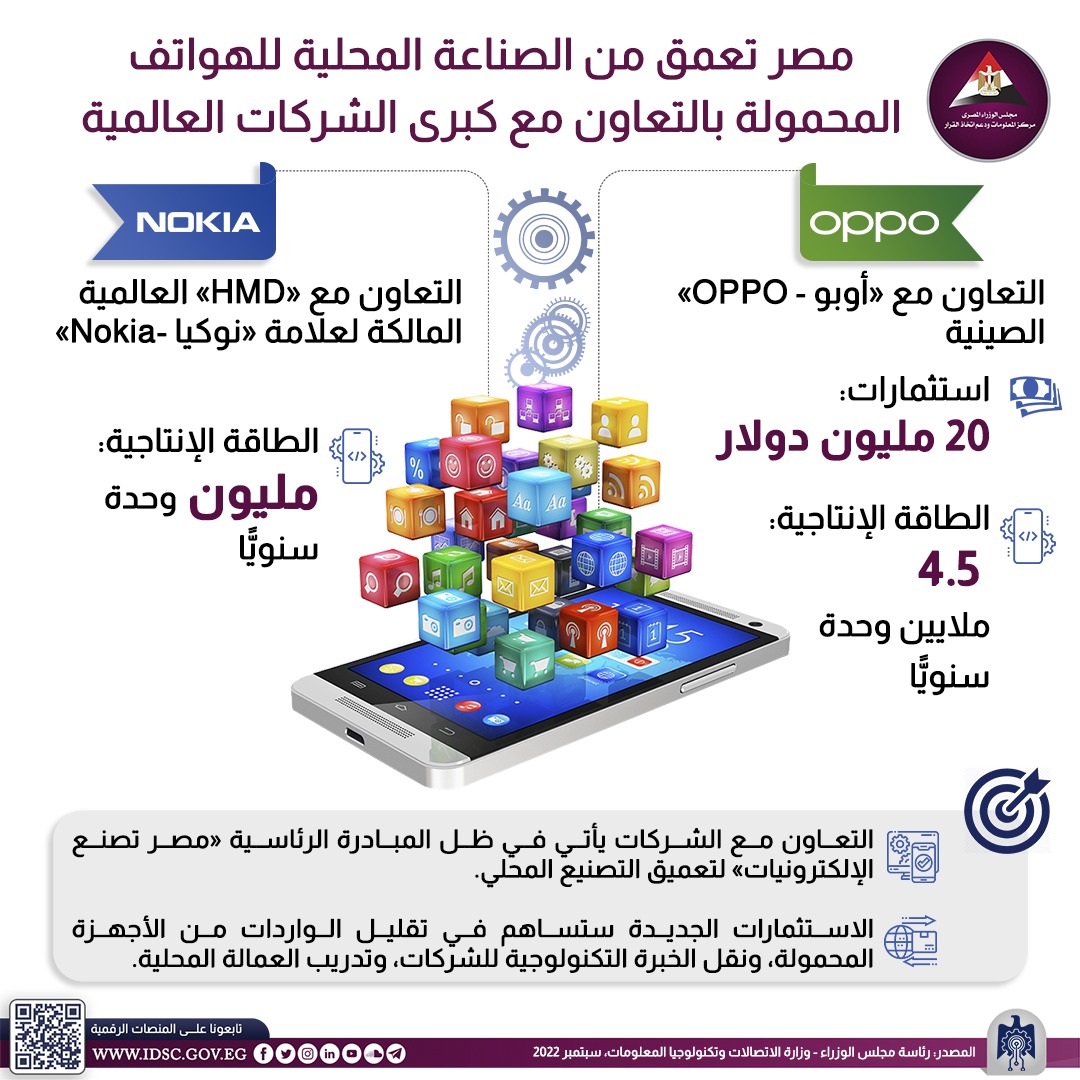 نشر مركز المعلومات ودعم اتخاذ القرار بمجلس الوزراء انفوجراف جديد تحت عنوان “مصر تعمق من الصناعة المحلية للهواتف المحمولة بالتعاون مع كبري الشركات العالمية".