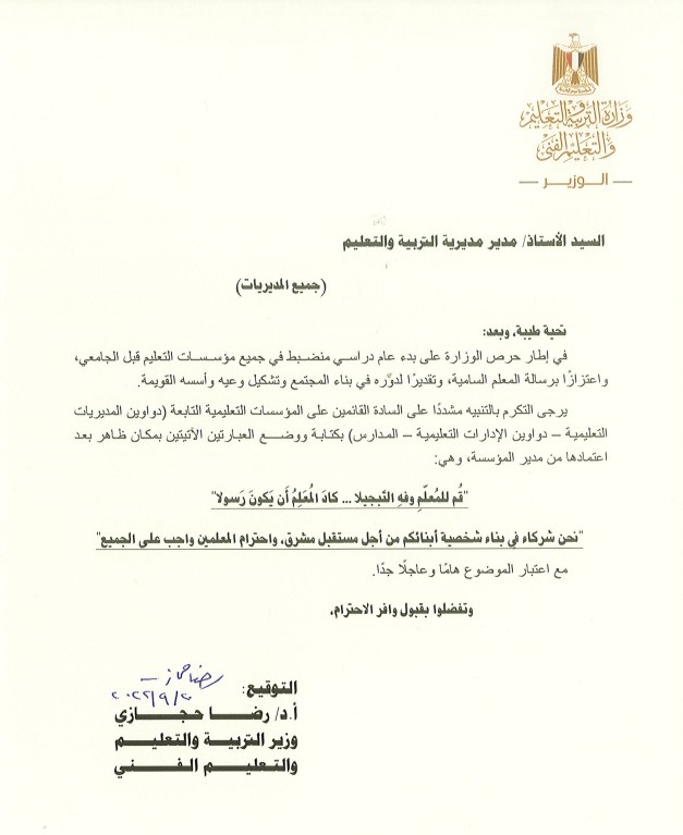 ووجهت وزارة التربية والتعليم والتعليم الفني، في خطاب لجميع المديريات التعليمية علي ضرورة الاعتزاز برسالة المعلم، وعلى ضرورة كتابة ووضع العبارتين بمكان ظاهر داخل المدرسة وهما: