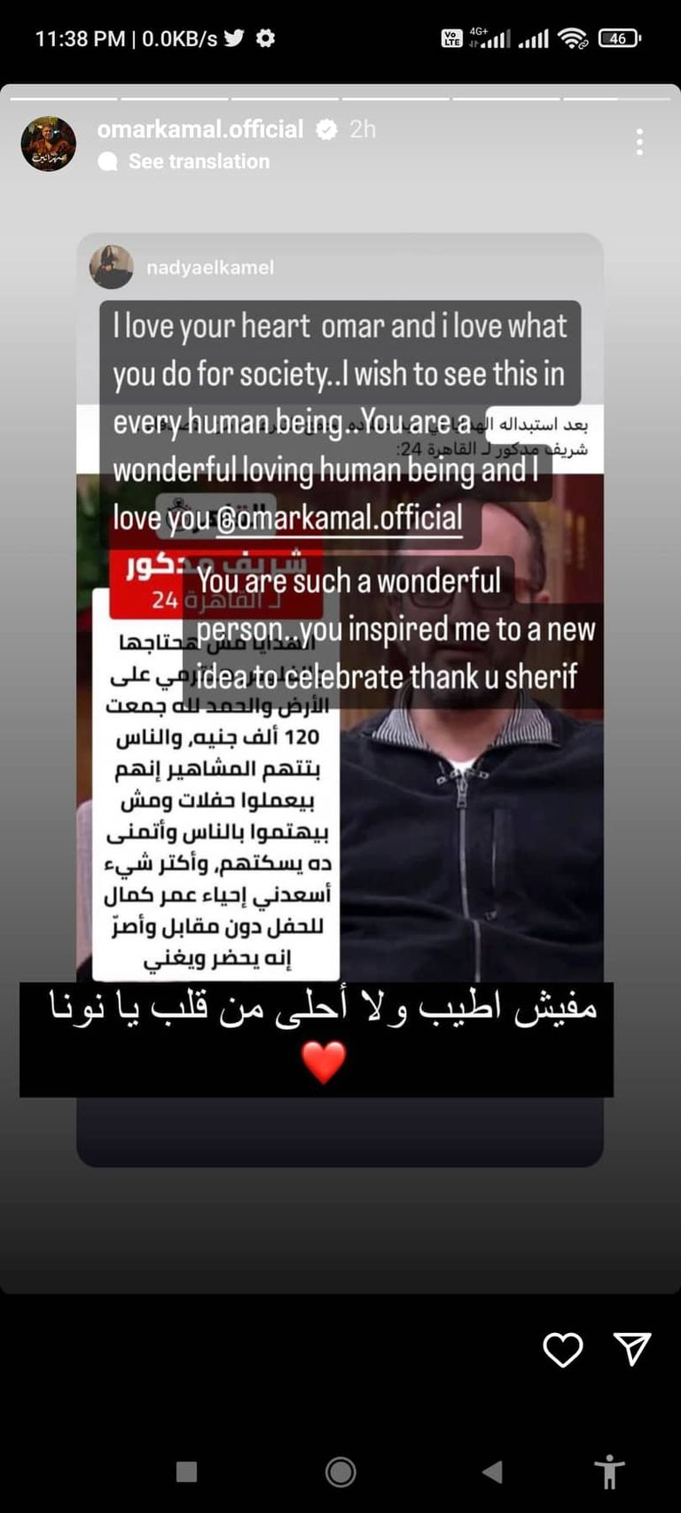 وعلقت ندى على هذه التصريحات بتوجيه رسالة إلى كمال، مفادها: "أحب قلبك يا عمر كما أحب ما تفعله للمجتمع.. أتمنى أن أرى هذا من جانب الجميع، أنت رائع ومحب للإنسانية وأحبك".