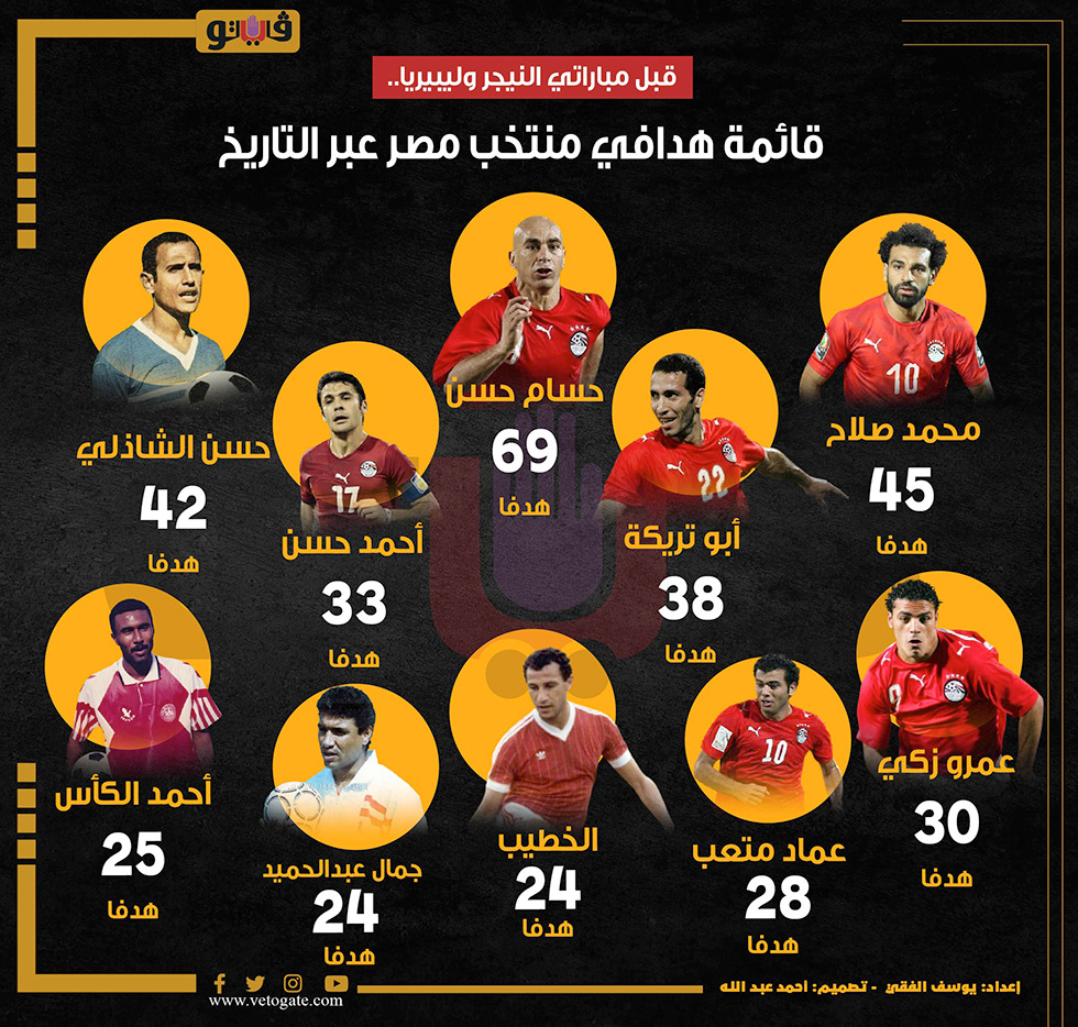 قبل مباراتي النيجر وليبيريا.. قائمة هدافي منتخب مصر عبر التاريخ | إنفوجراف الأربعاء 21/سبتمبر/2022 - 07:09 م 9/21/2022 7:09:45 PM حسام حسن يوسف الفقي شارك طباعة 18 حجم الخط شارك طباعة الهداف التاريخي لمنتخب مصر هدافي منتخب مصر عبر التاريخ منتخب مصر محمد صلاح حسام حسن