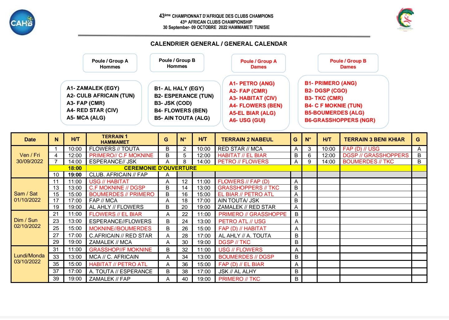 أعلن الاتحاد الأفريقي لكرة اليد، عن جدول مباريات الأهلي والزمالك في منافسات البطولة الأفريقية للأندية أبطال الدوري، والمقرر إقامتها خلال الفترة من 30 سبتمبر وحتى 9 أكتوبر المقبل، في مدينة الحمامات التونسية.
