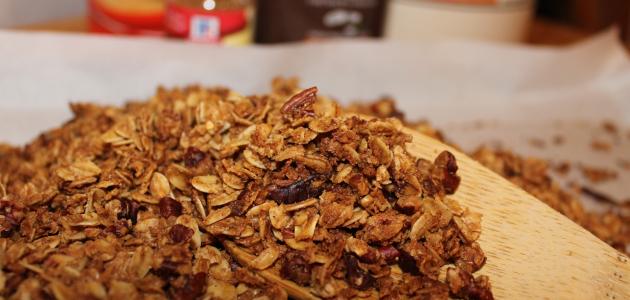 - نرفع خليط الجرانولا ونفرده في صينية مع الضغط عليها حتى تصبح متساوية.