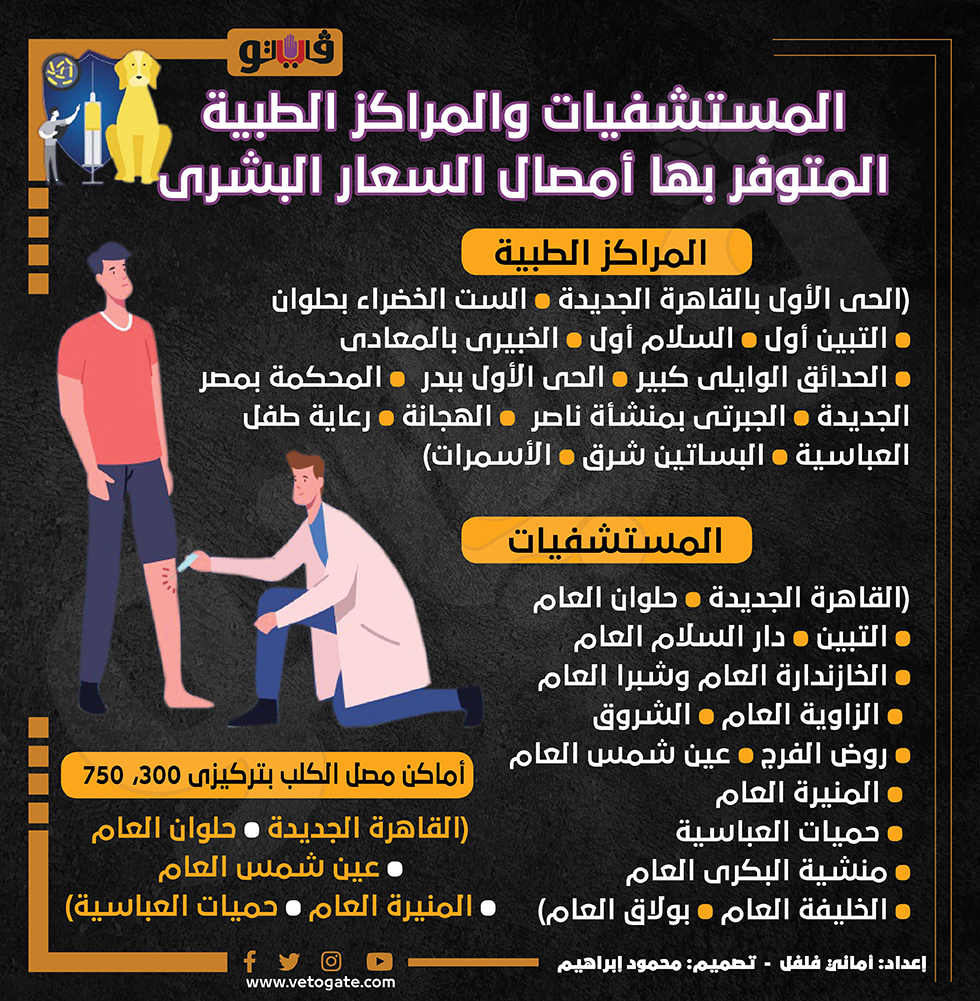 المستشفيات والمراكز الطبية المتوفر بها أمصال السعار البشرى | إنفوجراف الخميس 22/سبتمبر/2022 - 03:38 م 9/22/2022 3:38:17 PM الكلب أماني فلفل شارك طباعة 18 حجم الخط شارك طباعة القاهرة الجديدة حميات العباسية روض الفرج