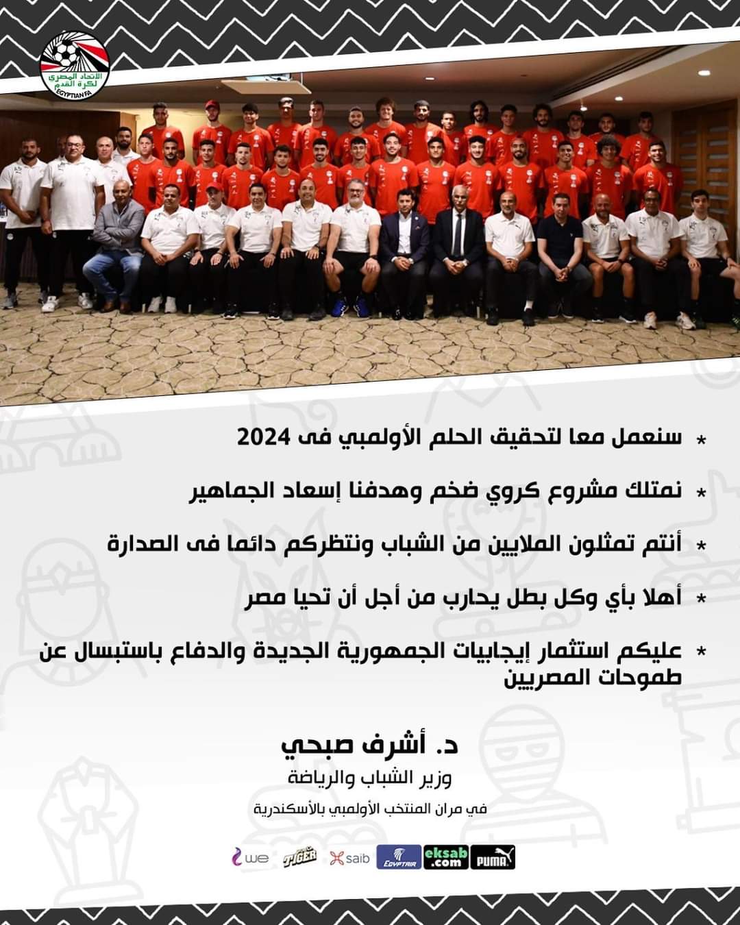 وأتت رسائل أشرف صبحي للمنتخب الأولمبي كالتالي: