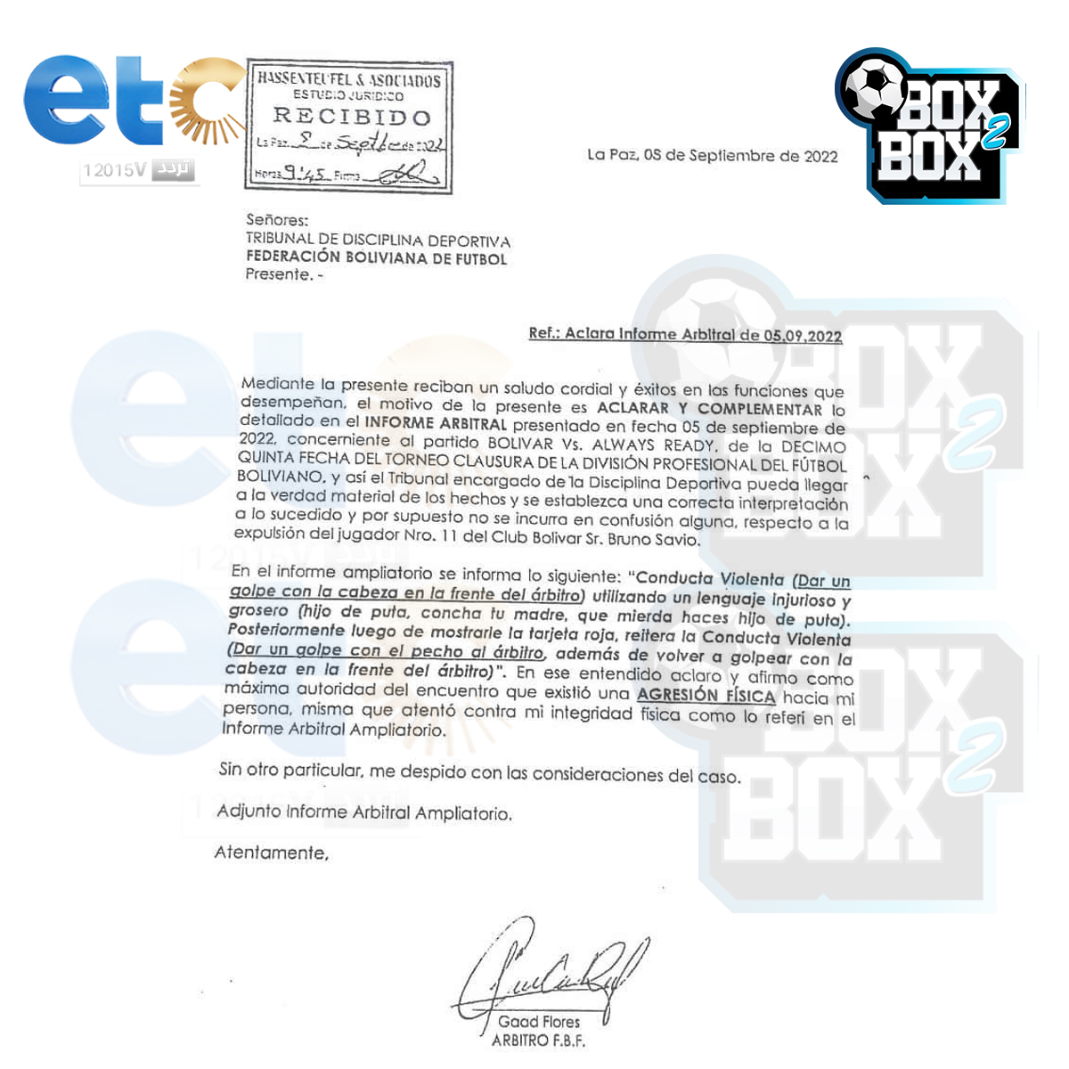 وانفرد "بوكس تو بوكس" بنص تقرير الحكم جاد فلورس الذي تعرَّض للاعتداء من لاعب الأهلي الجديد برونو سافيو.