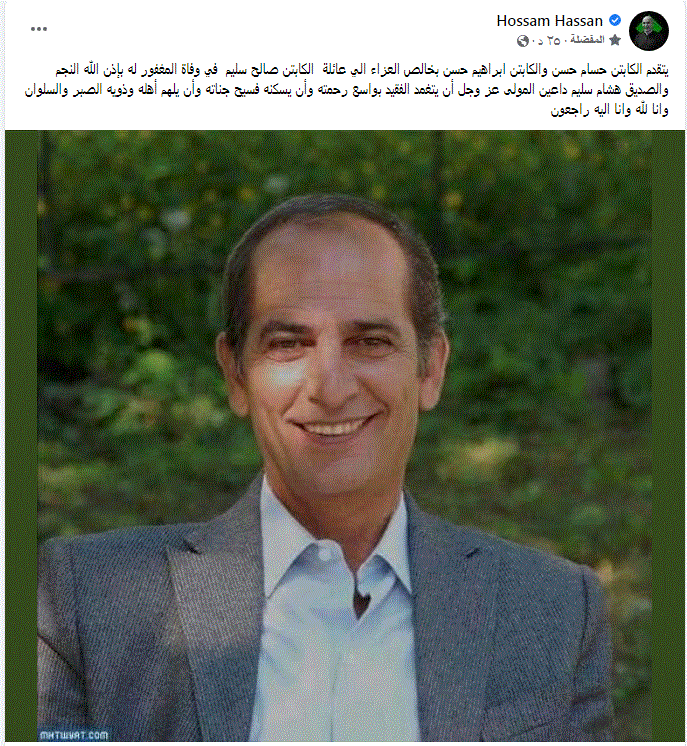 نعي كابتن حسام حسن نجم الأهلي والزمالك ومنتخب مصر وفاة الفنان الكبير هشام سليم التي وافته المنية اليوم عبر صفحته الشخصية بموقع التواصل الاجتماعي “فيس بوك”.