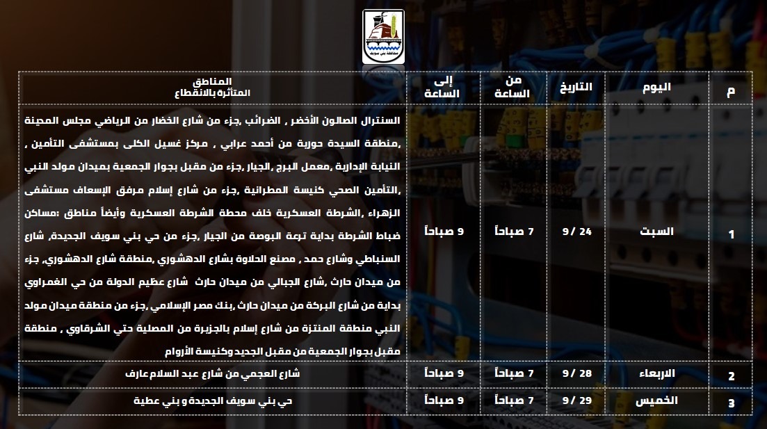 فيما تقرر فصل التيار الكهربائي يوم "الأربعاء" عن: شارع العجمي من شارع عبد السلام عارف، ويوم "الخميس" عن: حي بني سويف الجديدة، وبني عطية، وذلك اعتبارًا من الساعة 7 صباحًا حتى 9 صباحًا على مدار الأيام الثلاثة المذكورة وبحسب الترتيب المُوضح عاليه.