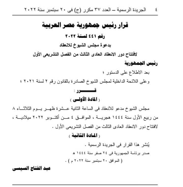 دعا الرئيس عبد الفتاح السيسي، مجلس الشيوخ، برئاسة المستشار عبد الوهاب عبد الرازق، للانعقاد لافتتاح دور الانعقاد العادي الثالث من الفصل التشريعي الأول في الساعة الثانية عشرة ظهـر يـوم الثلاثـاء الموافق ٨ أكتوبر.
