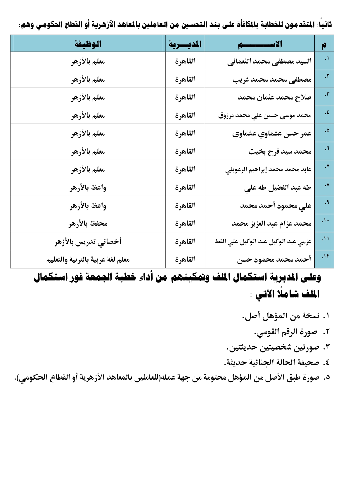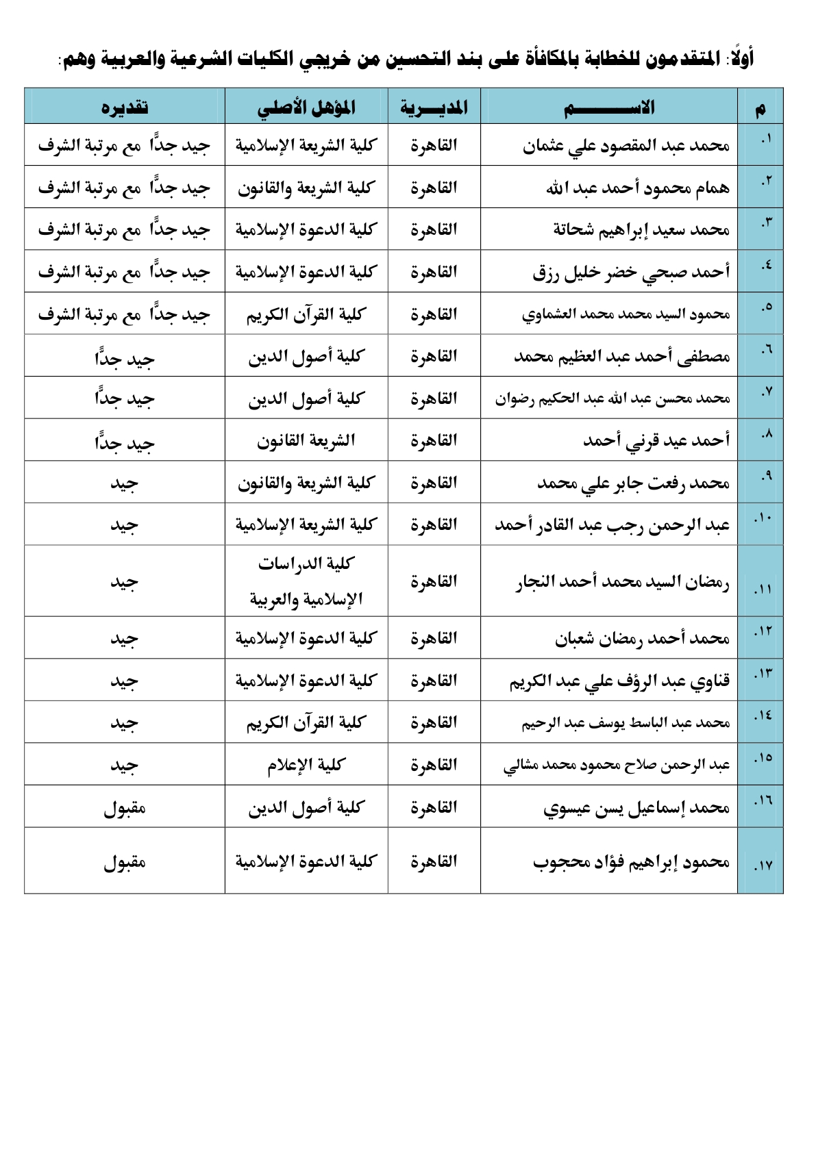 نشرت وزارة الأوقاف أسماء الناجحين من محافظة (القاهرة) المتقدمين للخطابة بالمكافأة على بند التحسين من خريجي الكليات الشرعية والعربية ، ومن العاملين بالمعاهد الأزهرية أو القطاع الحكومي 2022 م، وسننشر تباعًا أسماء باقي الناجحين ممن تم امتحانهم من المحافظات الأخرى، وهـــــــــــم على النحو التالي:
