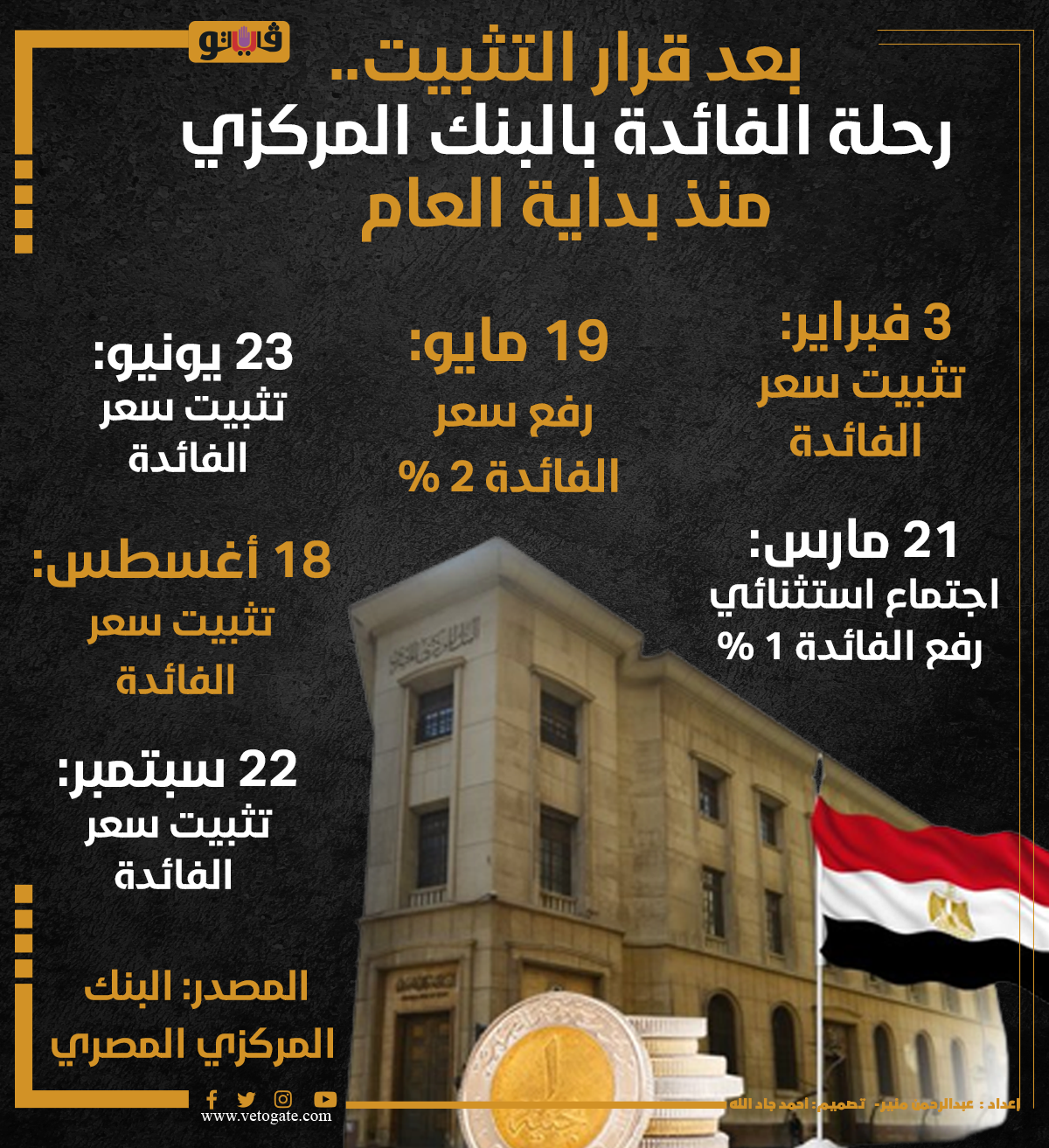 بعد قرار التثبيت.. رحلة الفائدة بالبنك المركزي منذ بداية العام | إنفوجراف الخميس 22/سبتمبر/2022 - 08:59 م 9/22/2022 8:59:08 PM البنك المركزي المصري حاتم أحمد شارك طباعة 18 حجم الخط شارك طباعة سعر الفائدة البنك المركزى تثبيت سعر الفائدة رفع سعر الفائدة لجنة السياسة النقدية