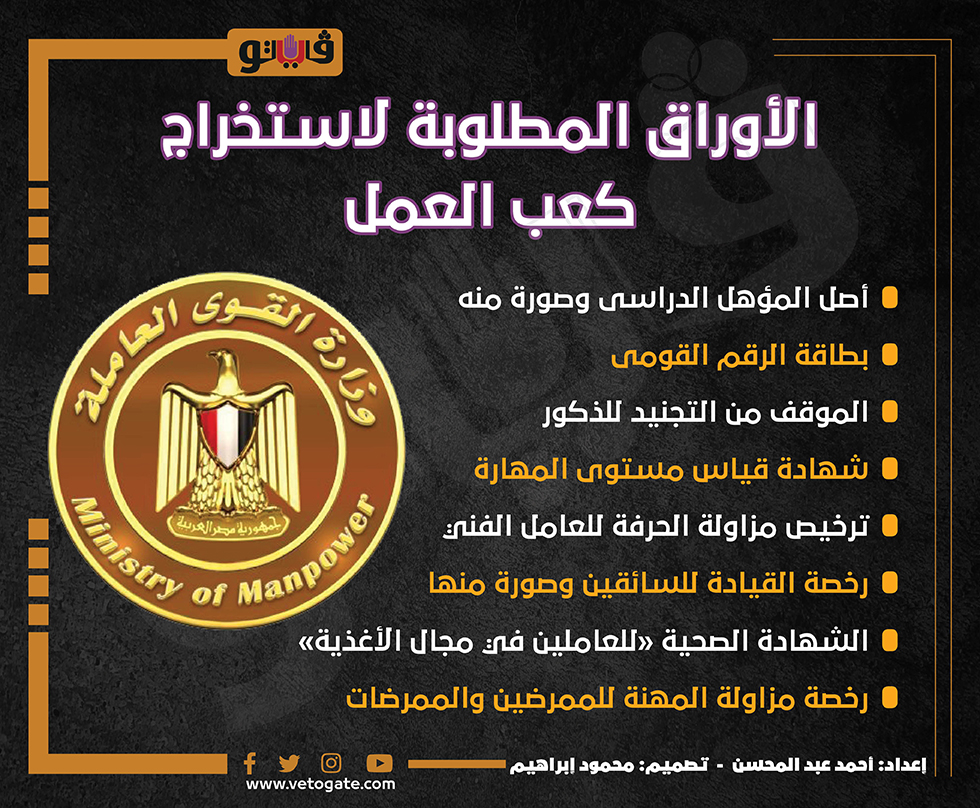 الأوراق المطلوبة لاستخراج كعب العمل | إنفوجراف السبت 24/سبتمبر/2022 - 11:53 ص 9/24/2022 11:53:06 AM وزارة القوى العاملة أحمد عبدالمحسن شارك طباعة 18 حجم الخط شارك طباعة المؤهل الدراسي جان رخصة مزاولة المهنة كعب العمل مزاولة المهنة رخصة القيادة الشهادة الصحية