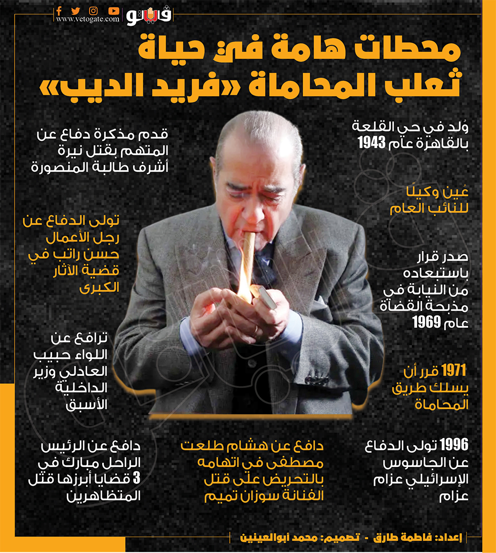 محطات هامة في حياة ثعلب المحاماة "فريد الديب" | إنفوجراف الجمعة 23/سبتمبر/2022 - 10:03 م 9/23/2022 10:03:26 PM فريد الديب فاطمة طارق شارك طباعة 18 حجم الخط شارك طباعة الاثار الكبري الرئيس جمال عبد الناصر المتهم بقتل نيرة اشرف هشام طلعت مصطفى حبيب العادلي وزير الداخلية الاسبق حبيب العادلى قضية الاثار الكبري قتل نيرة أشرف