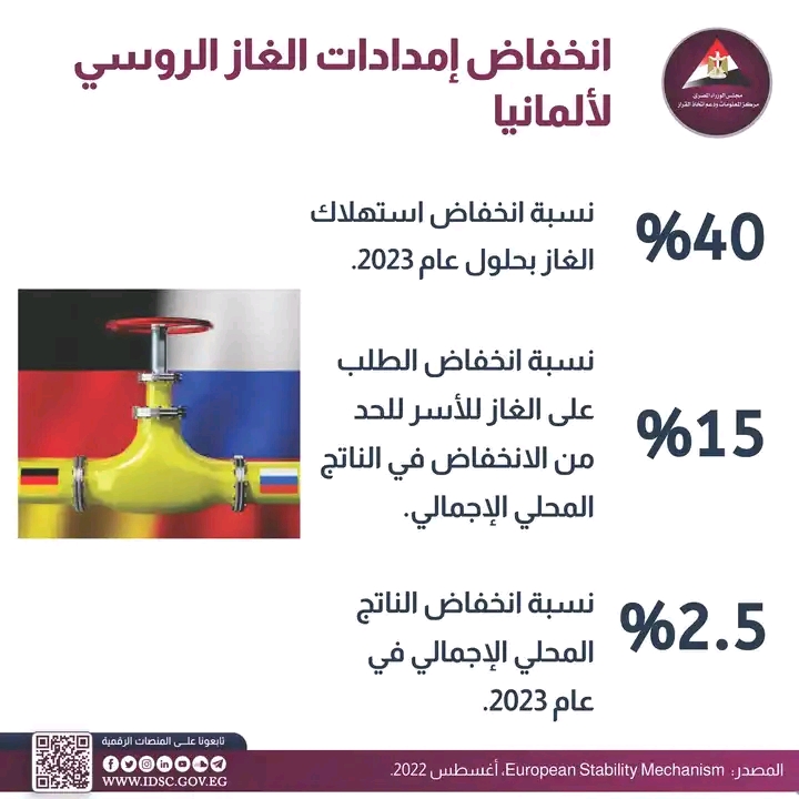 نشر مركز المعلومات ودعم اتخاذ القرار بمجلس الوزراء إنفوجراف جديد تحت عنوان "انخفاض إمدادات الغاز الروسي لألمانيا".