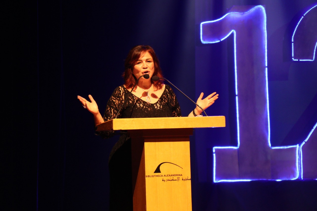 كرم مهرجان الإسكندرية المسرحي في دورته الثانية عشرة، الفنانة إلهام شاهين خلال حفل الافتتاح، والذي أقيم على مسرح مكتبة الإسكندرية، مساء اليوم الجمعة، بحضور كوكبة من الفنانين والمسرحيين والنقاد.