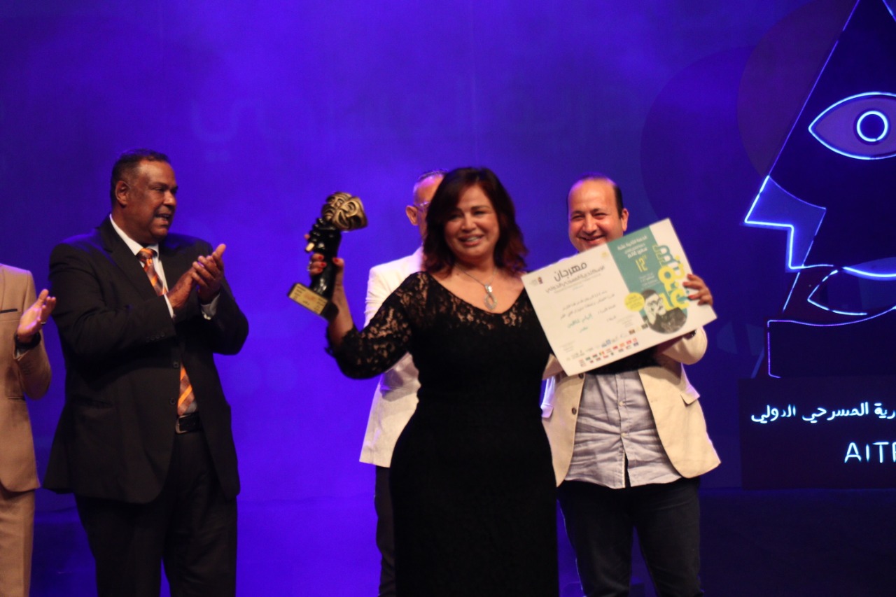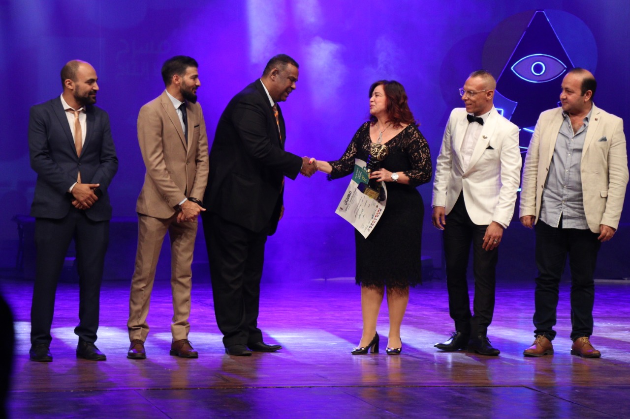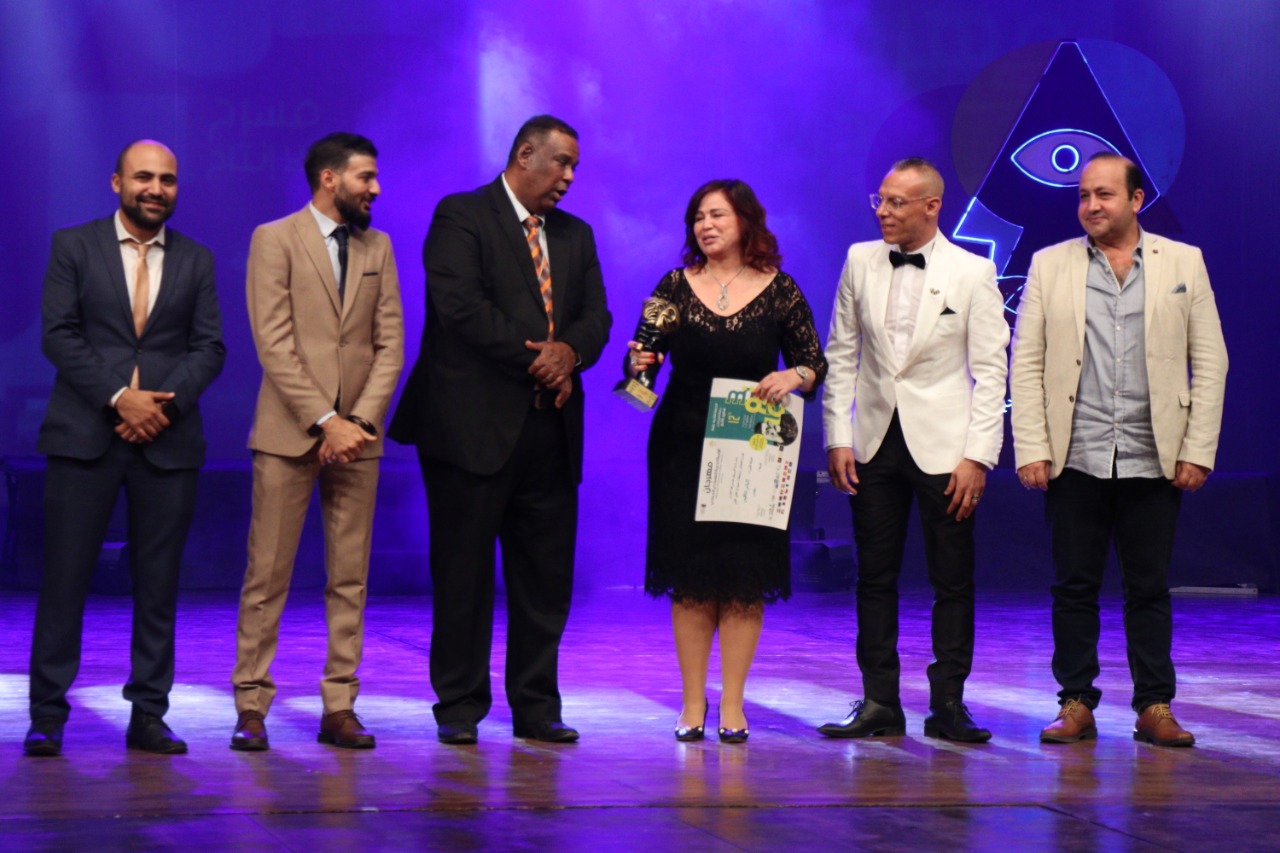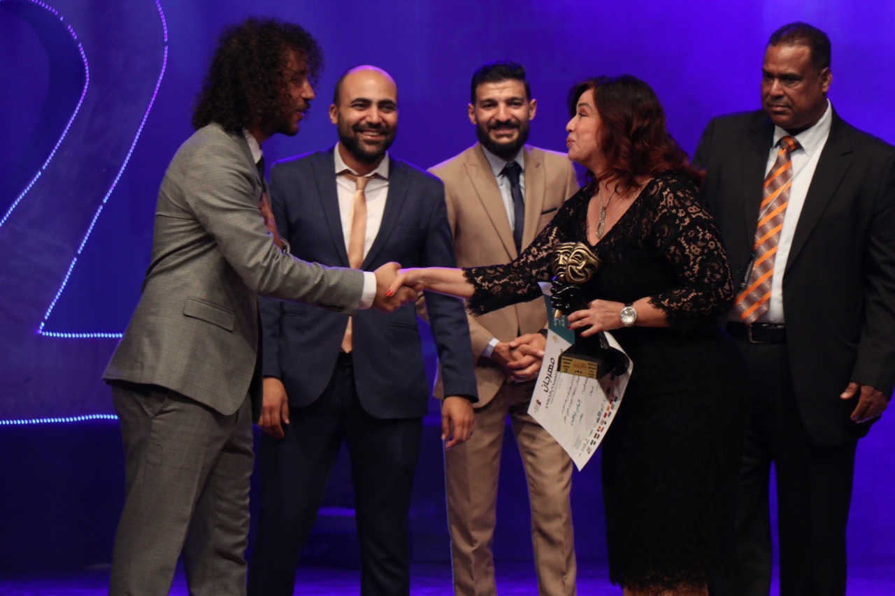 وسلم المهرجان الفنانة إلهام شاهين درع المهرجان، وشهادة تقدير، وسط تفاعل الحاضرين في المسرح.